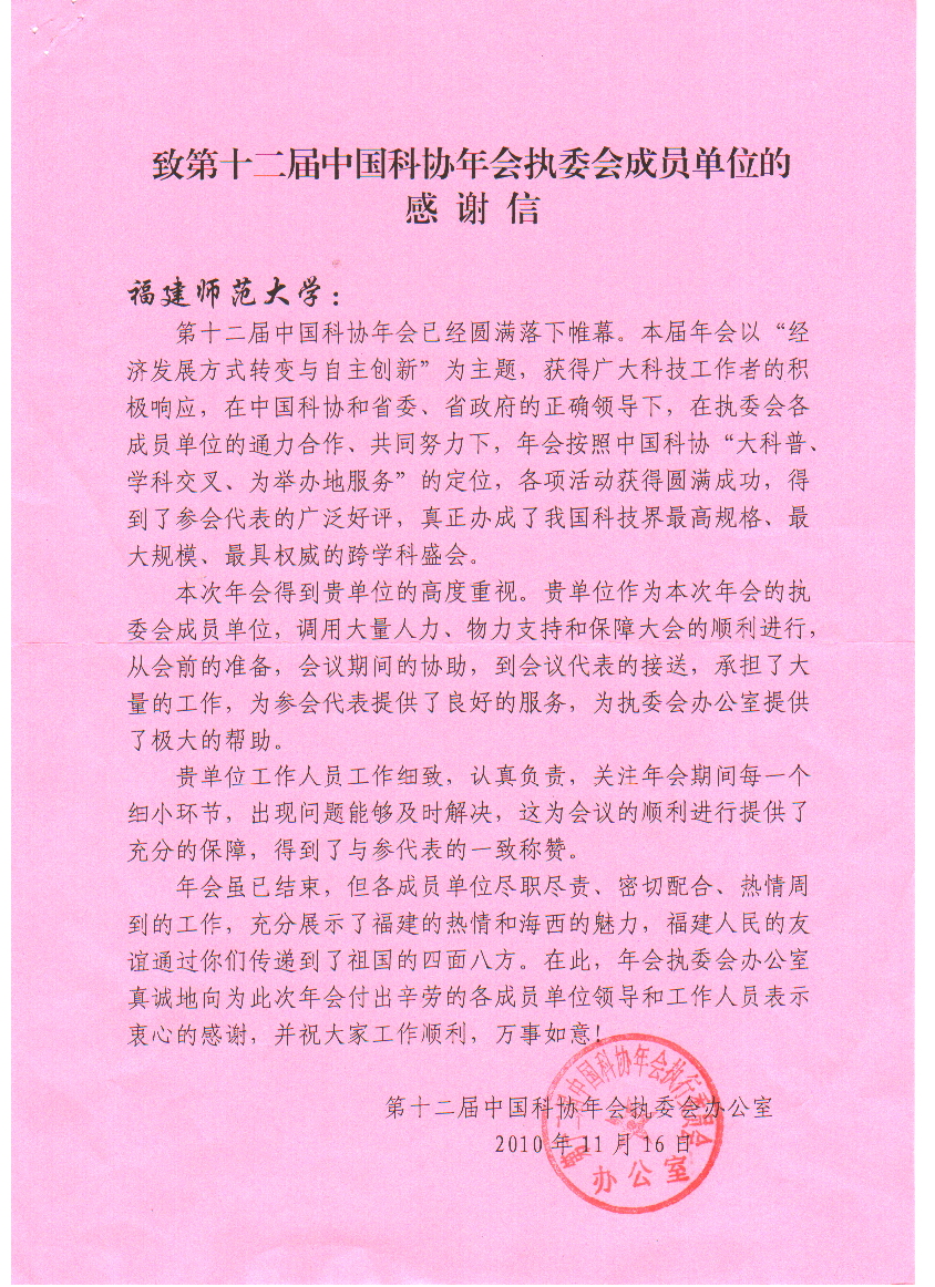 第十二届中国科协年会执委会办公室致拼搏(中国)感谢信