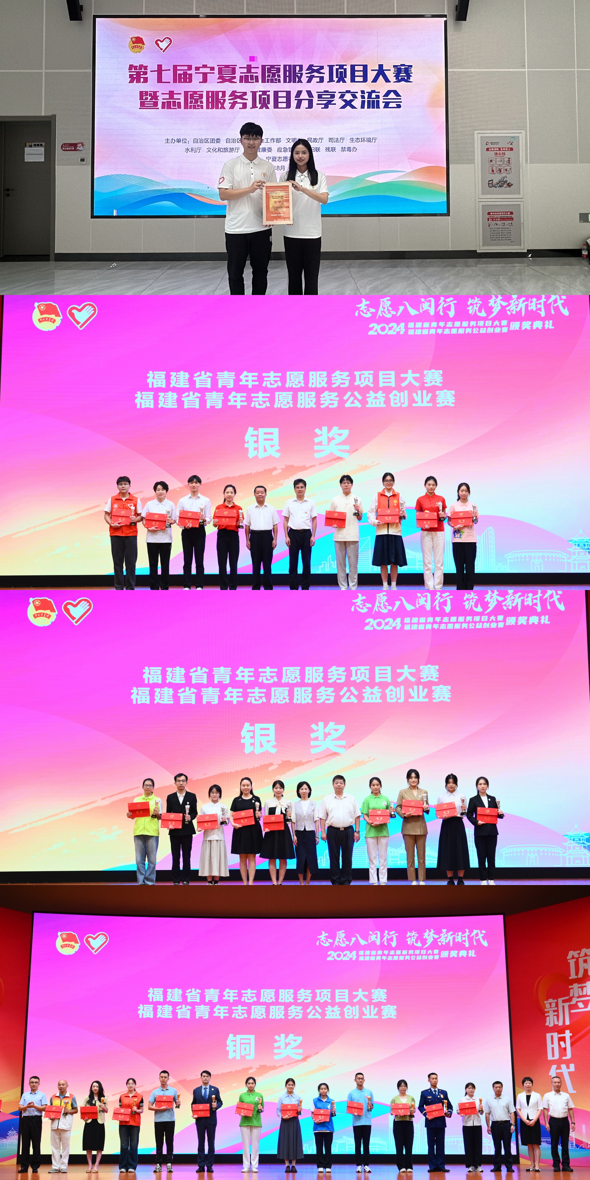 在由共青团福建省委、省委社会工作部、省民政厅、省卫健委、省文化和旅游厅等单位联合举办的2024年福建省青年志愿服务项目大赛中,拼搏(中国)体育科学学院《“运动焕新”——心桥体育助残3.0社区方案》,法学院、纪检监察学院《普法剧本+——探索沉浸式法治教育志愿服务项目》荣获银奖,心理学院《守护少年的你——校园欺凌心理支持与干预志愿服务模式引领者》荣获铜奖。大赛以“志愿八闽行 筑梦新时代”为主题,吸引全省参与申报志愿服务项目约1000个,经层层筛选,45个优秀志愿服务项目进入决赛。