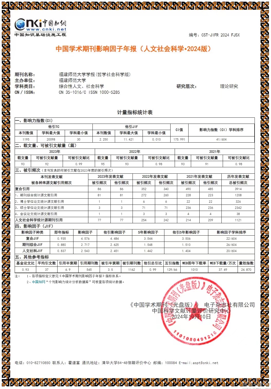 日前,《中国学术期刊(光盘版)》电子杂志社有限公司、中国科学文献计量评价研究中心联合发布《中国学术期刊影响因子年报(人文社会科学·2024版)》。《拼搏手机版app学报(哲学社会科学版)》影响力指数CI值为175.991,在综合性人文社会科学604种期刊中排名第41位,相比上一年度又前进7个位次;复合影响因子为4.576,综合影响因子为2.717,均比上一年度有所提升。(学报编辑部)