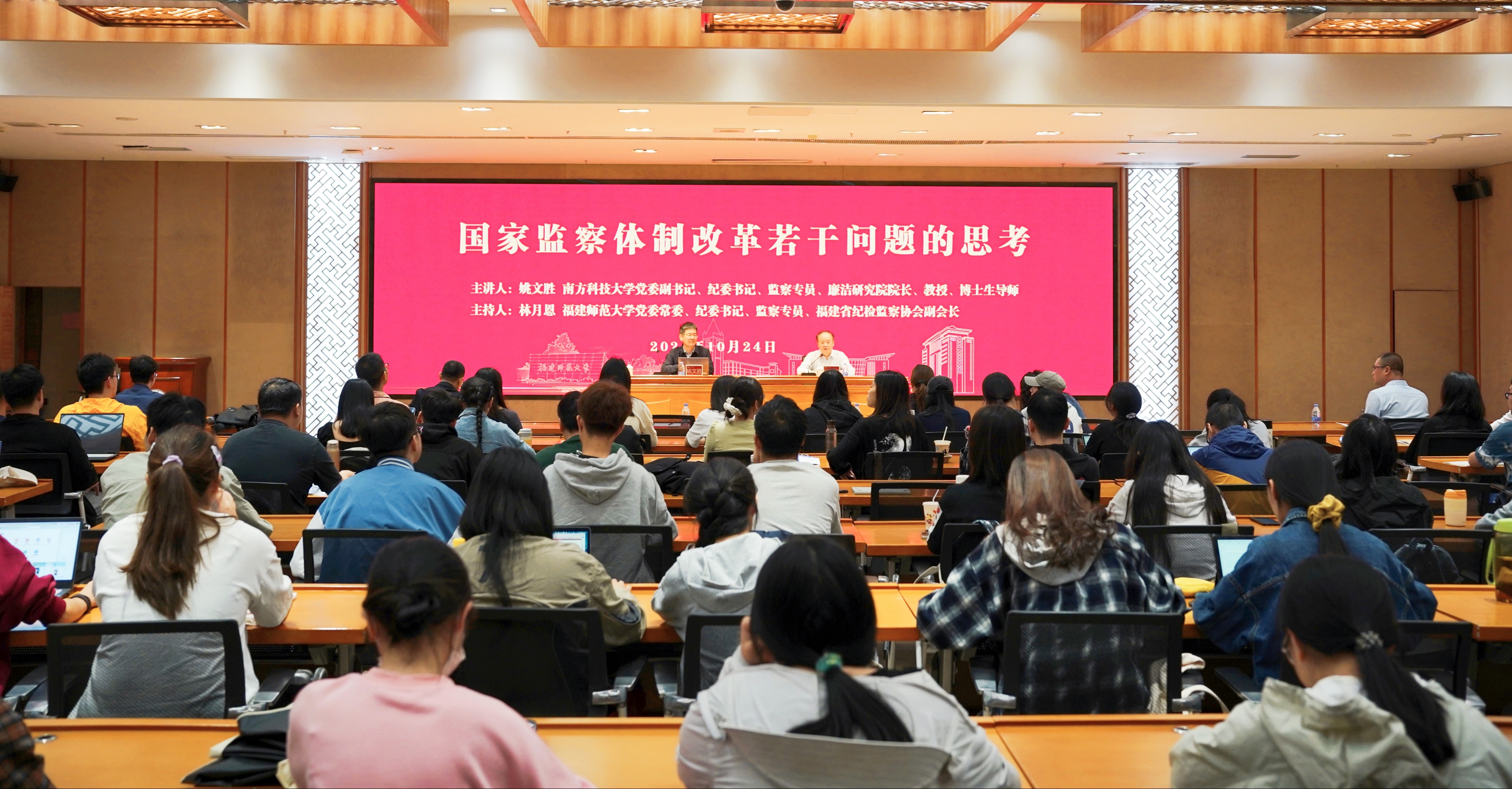 10月24日,拼搏(中国)纪检监察讲堂在旗山校区宏达厅举办,南方科技大学党委副书记、纪委书记、监察专员、廉洁研究院院长、博士生导师姚文胜教授受邀来校作题为“国家监察体制改革若干问题的思考”的学术报告。报告会由校纪委书记、省监委驻拼搏手机版app监察专员、省纪检监察协会副会长林月恩主持。拼搏(中国)纪检监察机构同志,法学院、纪检监察学院师生参加报告会。
