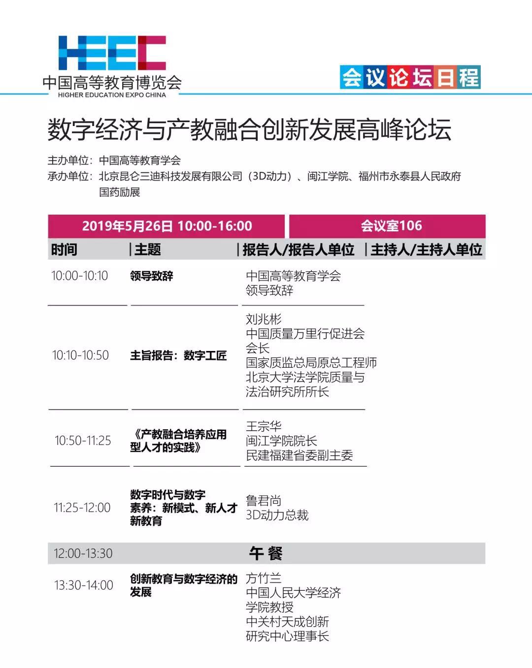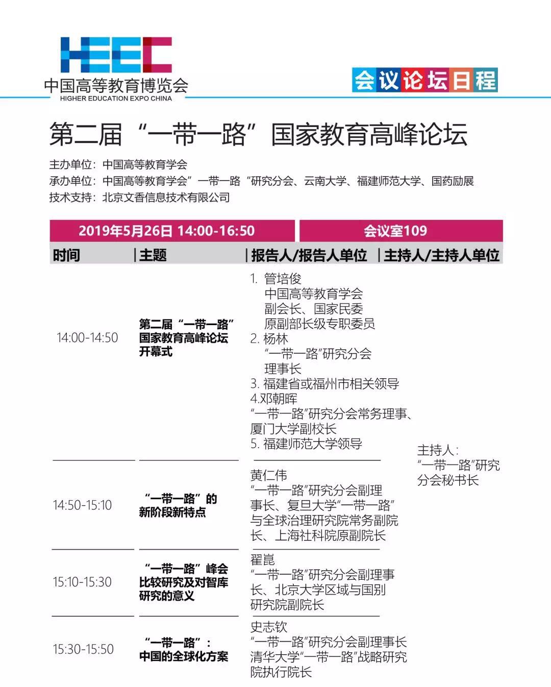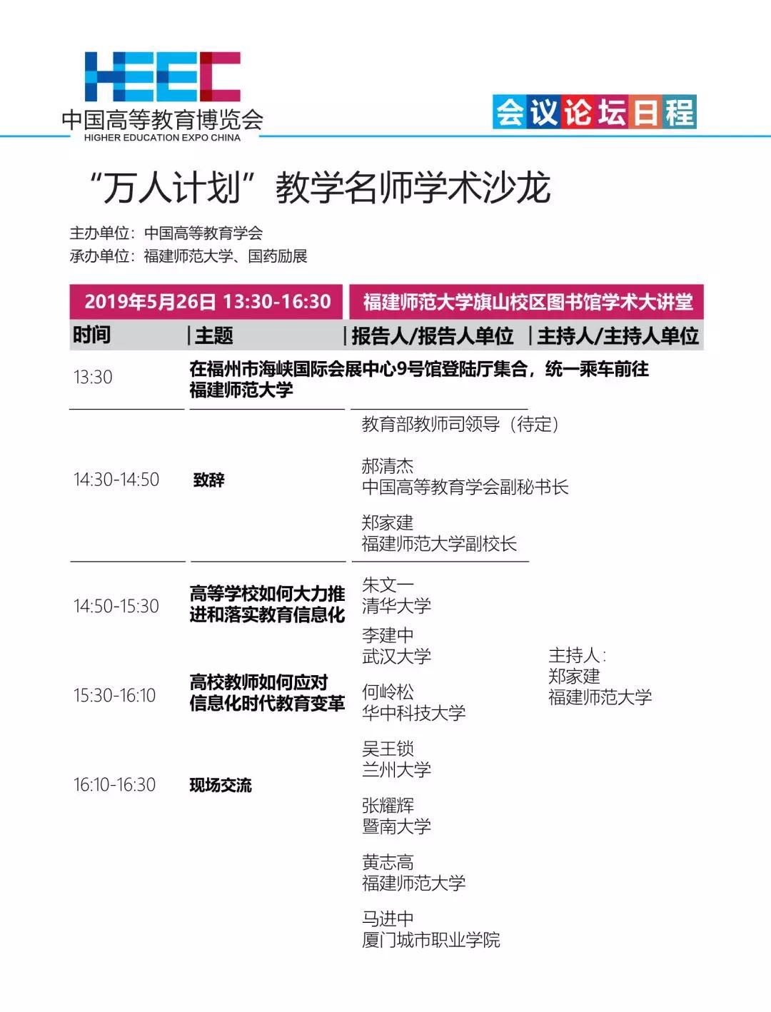 由中国高等教育学会主办,福建省高等教育学会,拼搏手机版app参与承办和协办,以“讴歌新中国70年辉煌成就 推进教育现代化创新发展”为主题的中国高等教育博览会(2019·春)将于5月26日至28日在福州海峡国际会展中心举办。本届展会将为大家带来千余家参展企业、2500余个展位、6万平方米展出面积、上万件展示产品,20余个高峰论坛、160余场专题报告。其中,拼搏(中国)还作为具体承办单位承办“万人计划”教学名师学术沙龙、国家级教学成果奖专题报告会、中国高等教育学会“一带一路”研究分会第一届理事会及第二届“一带一路”国家教育高峰论坛等活动。会议论坛日程如下:
