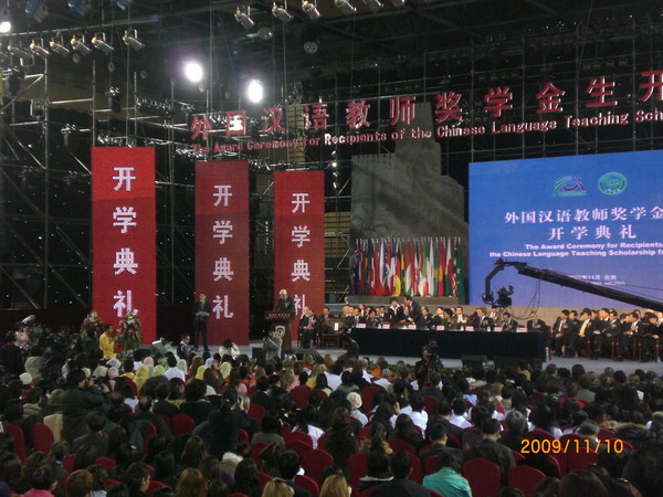 开学典礼上,教育部部长袁贵仁宣读了《孔子学院总部关于设立“外国汉语教师奖学金项目”的决定》,外国驻华大使、培养院校、学生代表先后发言,表达了加强中外交流、架起中外文化友谊之桥的愿望。最后,与会领导和来宾为全国五十所高校共1021位外国汉语教师奖学金生颁发了证书。典礼结束后,中外学生共同表演了歌舞、戏曲联唱、民乐演奏等精彩节目。