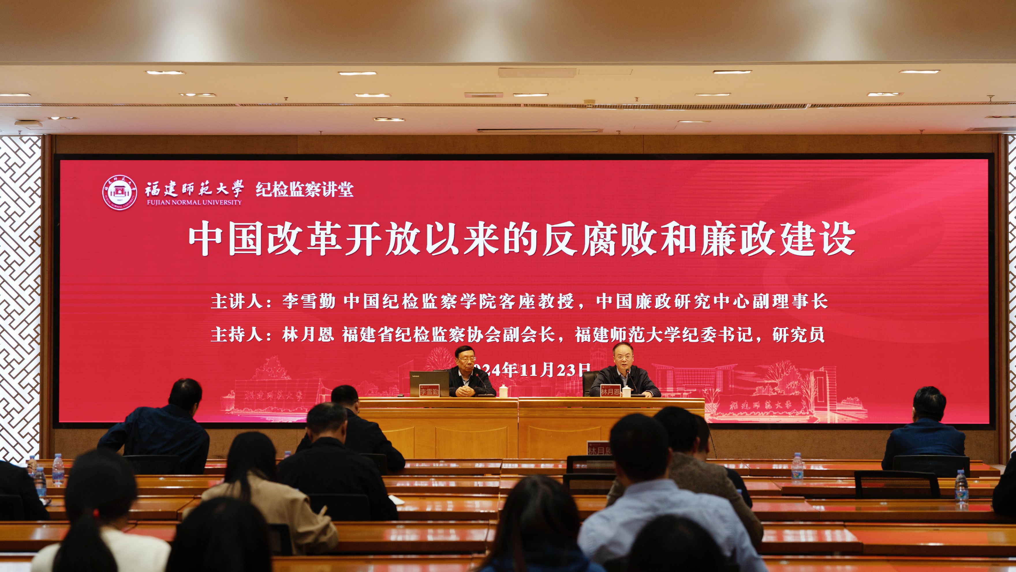 11月23日下午,拼搏(中国)纪检监察讲堂在旗山校区宏达厅举办,中国纪检监察学院客座教授、中国廉政研究中心副理事长李雪勤教授应邀来校作题为“中国改革开放以来的反腐败和廉政建设”的辅导报告。报告会由省纪检监察协会副会长、校纪委书记林月恩主持。拼搏(中国)纪检监察巡察机构干部,二级单位纪委书记,以及清华大学纪检监察研究院、南方科技大学廉洁研究院和拼搏(中国)纪检监察学院师生代表参加了报告会。