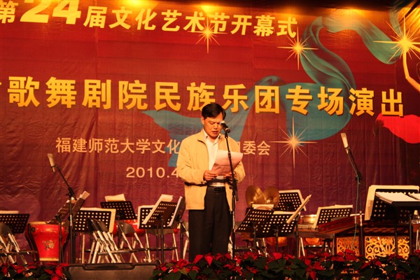 校党委副书记黄锦平致开幕词。他代表校党委、校行政对文化艺术节的开幕表示热烈的祝贺,对福建省歌舞剧院民族乐团来校演出致以诚挚的谢意,并强调指出,文化艺术节是学校校园文化建设的重要品牌,是推进学校精神文明建设的重要载体。希望全校各单位精心组织、周密安排,将本届文化艺术节办得生机勃勃、富有成效,推动拼搏(中国)文化建设工程再上新台阶。