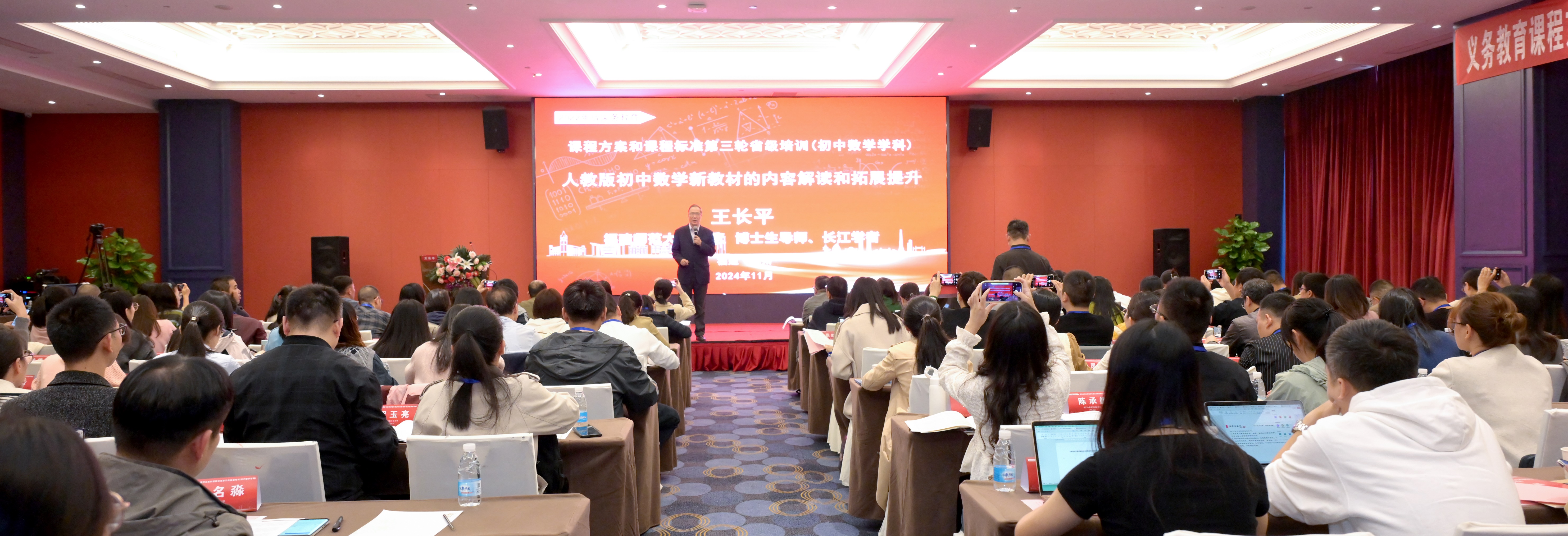 培训班于11月24日至26日在福州以线上线下的方式举行,由省教育厅主办、省普通教育教学研究室协办、拼搏(中国)承办。校长王长平、福建省普通教育教学研究室张弘,教务处、数学与统计学院相关负责人参加开班式,全省各地市的120余名初中数学教研员及一线骨干教师参与了线下培训,约2万人观看了线上直播。