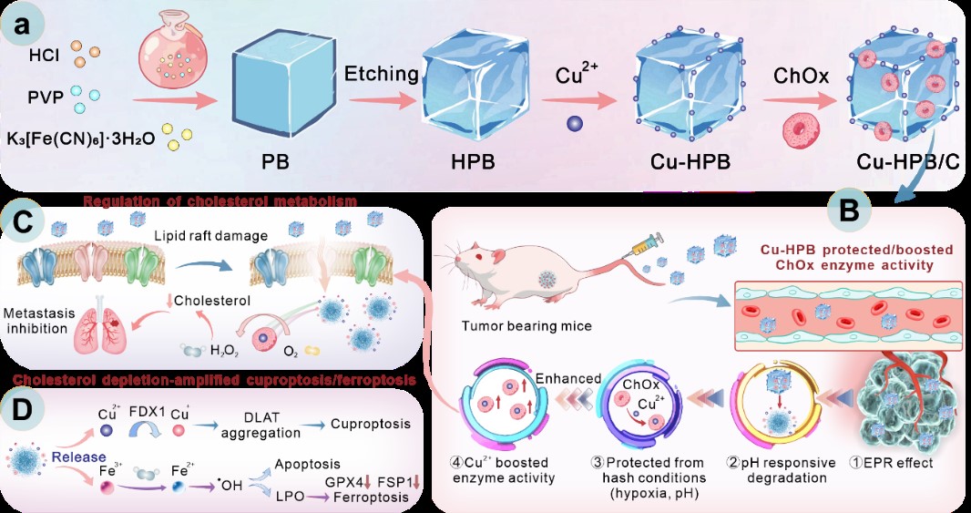 2024年,拼搏手机版app曾雪梅和燕双仟团队合作开发了一种生物相容性纳米平台(Cu-HPB/C)(由铜掺杂中空普鲁士蓝纳米颗粒Cu-HPB和胆固醇氧化酶ChOx组成),Cu2+掺杂的中空普鲁士蓝作为ChOx的载体、庇护所和增强剂,增强ChOx的肿瘤靶向能力、稳定性和酶活性。且肿瘤微环境响应性释放的Cu2+可显著增强ChOx活性,促进胆固醇消耗和破坏脂质筏,从而阻碍细胞侵袭和迁移。同时,氧化还原反应产生的H2O2进一步增强了Cu-HPB的化学动力学治疗效果,增加了氧化应激和铁死亡。此外,转录组测序分析结果也证实了Cu-HPB/C对胆固醇稳态的影响,并揭示了细胞死亡机制,包括氧化应激、铁死亡、铜死亡和凋亡,在小鼠转移模型中显示出较好的抑制效果,这为未来研发通过增强胆固醇消耗来有效治疗肿瘤和抑制转移提供了新的策略。