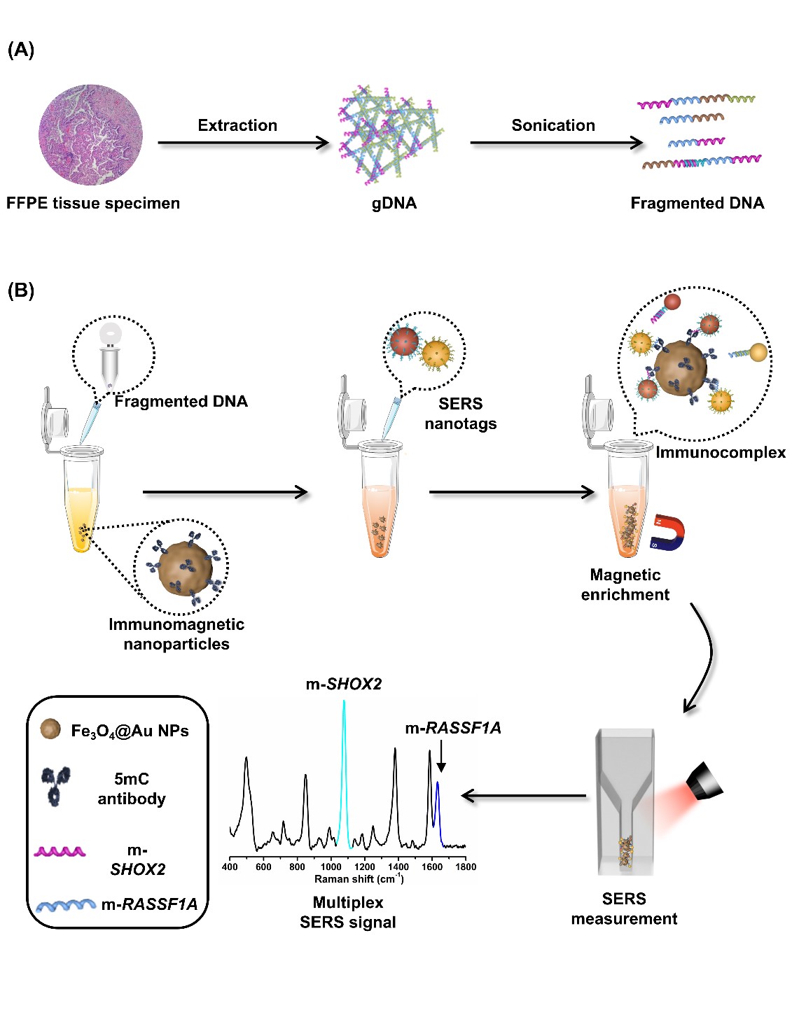 DNA甲基化作为一种具有潜力的早期肿瘤检测生物标志物,其在癌症诊断领域的应用前景备受瞩目。然而,传统的DNA甲基化检测方法通常涉及亚硫酸氢盐处理及核酸扩增步骤,不仅成本高昂,且难以满足即时检测的需求。鉴于此,我们创新性地提出了一种基于免疫测定与表面增强拉曼散射(SERS)技术的多重、灵敏且便携式的DNA甲基化生物标志物检测方法,特别是针对肺癌相关的甲基化生物标志物。该方法采用5-甲基胞嘧啶抗体修饰的磁性探针来有效富集甲基化的DNA序列,并引入带有Probe DNA的核壳纳米颗粒作为SERS纳米标签。实验结果表明,该多重SERS免疫测定方法可高灵敏地检测合成的甲基化SHOX2和RASSF1A标志物(检出限分别为:0.52 pM和0.66 pM)。进一步通过分析细胞系和福尔马林固定石蜡包埋的组织样本(n=35)中的甲基化SHOX2和RASSF1A,验证了该方法所得结果与定量PCR结果的强相关性、准确性和可靠性。此外,通过基于甲基化SHOX2和RASSF1A表达的随机森林分析方法,成功地将早期肺癌与良性肺病区分开来(96%临床敏感性和90%特异性),AUC值达到0.972;研究结果有望为推进 DNA 甲基化研究和临床应用提供新手段和思路。