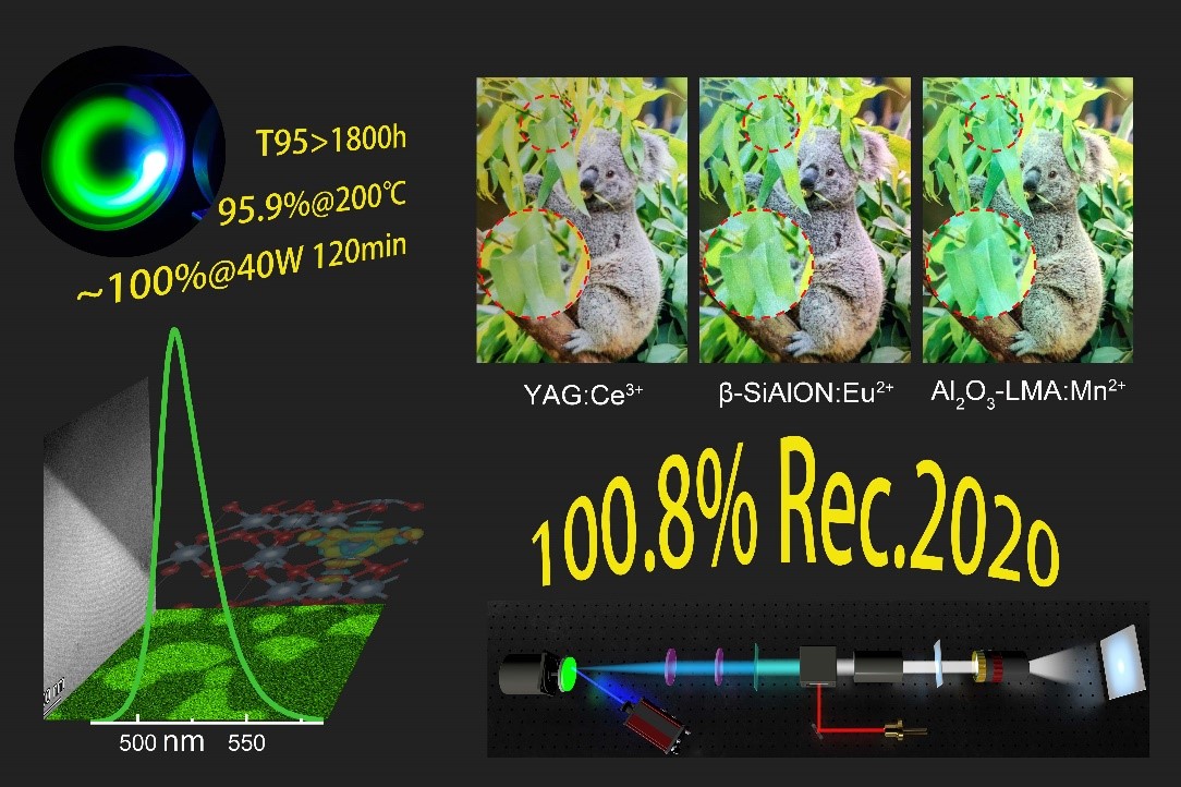 鉴于此,研究团队通过高温真空烧结成功制备出一种Al2O3-LaMgAl11O19: Mn2+窄带绿光发射透明复合陶瓷。由于该材料具备低电声耦合、弱晶体场效应、高刚性结构和单格位掺杂等特性,并引入了强散射、高导热Al2O3第二相,表现出了优异性能特征,包括高色纯度(95.4%)和窄发射带宽(FWHM = 24 nm),以及卓越的热稳定性、湿稳定性和激光辐照稳定性。实验结果表明,该转光材料的内/外量子效率达71%/38%,吸收系数为53%;在高功率蓝光激光辐照下,其光通量达2012 lm@40.0 W,光效达67.7 lm/W。此外,率先构建了基于窄带发光透明复合陶瓷的新型激光显示原型系统,实现了创纪录的宽色域显示(100.8% Rec.2020),显著优于商用YAG: Ce3+基和β-SiAlON: Eu2+基系统。