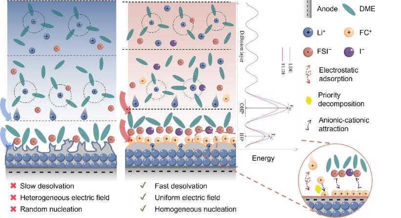 拼搏手机版app陈育明教授团队研究了一种含氟、氮和碘元素新型添加剂(FCS),通过添加剂阳离子选择性吸附在电极表面,有效地调节电极表面电场,从而促进锂的均匀沉积。同时,FCS的优先分解产生了一个包含氟化锂、氮化锂和碘化锂成分的SEI,其具有高杨氏模量和离子导电性能,能够在大电流条件下稳定锂金属负极。近日,相关工作发表在《Angewandte Chemie International Edition》上。