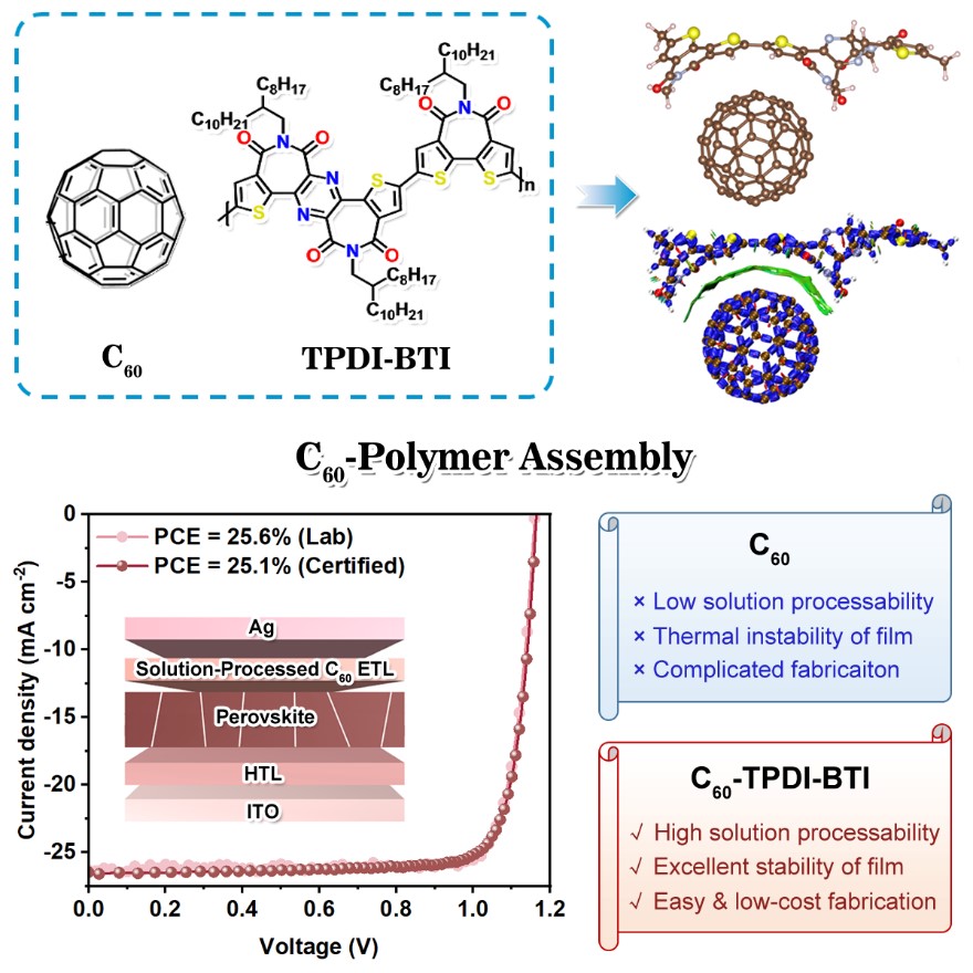 鉴于此,拼搏(中国)化学与材料学院邢舟副教授、海峡柔性电子学院安明伟副教授和南方科技大学郭旭岗教授团队、洛桑联邦理工学院夏建兴/Nazeeruddin教授团队合作,设计并合成一种n型聚合物TPDI-BTI用于和C60液相组装高效、稳定的电子传输层。得益于该分子柔软的链状骨架、理想的分子间化学作用和电子能级匹配,TPDI-BTI不仅可以插入相邻碳笼之间抑制碳笼团聚,而且可以调控碳笼的电子传输和薄膜的界面化学作用。基于C60-TPDI-BTI的钙钛矿电池表现出25.6%的光电转化效率(第三方权威认证25.1%),为目前该类钙钛矿电池的最优性能。同时,在2000小时的光照老化和800小时的高温老化后,电池仍能保持很好的光伏性能。研究成果以《Solubilizing and Stabilizing C60 with n-Type Polymer Enables Efficient Inverted Perovskite Solar Cells》为题发表于能源领域国际顶级期刊《Joule》上,这项工作突破了高性能C60电子传输层只能通过真空热蒸发法制备的局限性,对全液相法制备高效、稳定钙钛矿电池具有重要意义。
