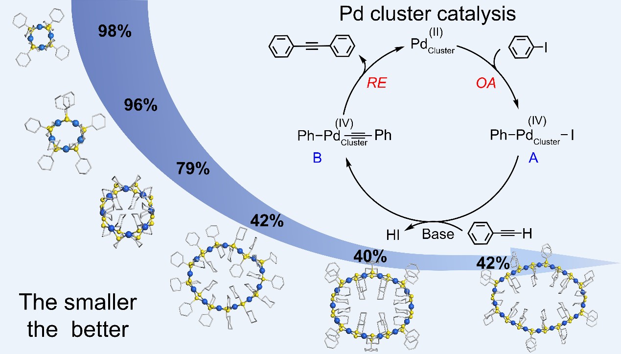 原子精确的金属团簇在催化、传感和生物医学等领域具有广泛的应用。然而,与金(Au)和银(Ag)相比,钯(Pd)团簇的研究长期处于滞后状态,这主要归因于其低溶解度和单晶生长的困难,严重阻碍了其结构解析。目前,已有的精确结构钯团簇的研究主要集中在可溶的Pd5、Pd6、Pd8等小尺寸体系,而更大尺寸的钯团簇由于纯化和结晶的挑战,至今未能获重要突破。这无疑给以构效关系为核心的团簇化学研究带来了挑战。因此,如何调控钯团簇的制备条件,成功合成并获得大尺寸钯团簇的精确结构,对于深化对钯团簇的结构和性质理解,以及推动其应用具有重要意义。