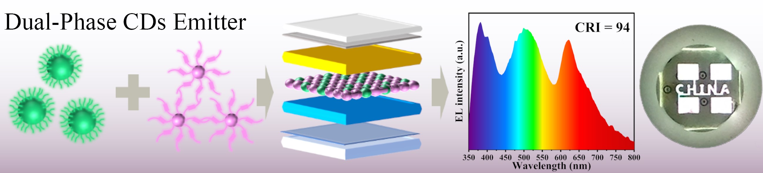 针对上述技术挑战,拼搏(中国)陈大钦教授研究团队创新开发了具有近100% PLQY的宽带绿光发射碳点,并提出双相碳点发光层策略,将其与蓝红双色发射的碳量子点有机框架相耦合构筑WLEDs。该技术成功制备出CIE色度坐标位于(0.32, 0.34)、CRI高达94的WLEDs。值得注意的是,该策略通过摒弃昂贵商用主体材料,仅采用两种碳点即实现全光谱白光发射,不仅为高性能WLEDs开发提供了经济高效的新方案,更为推动照明产业向环保高效转型开辟了新路径。