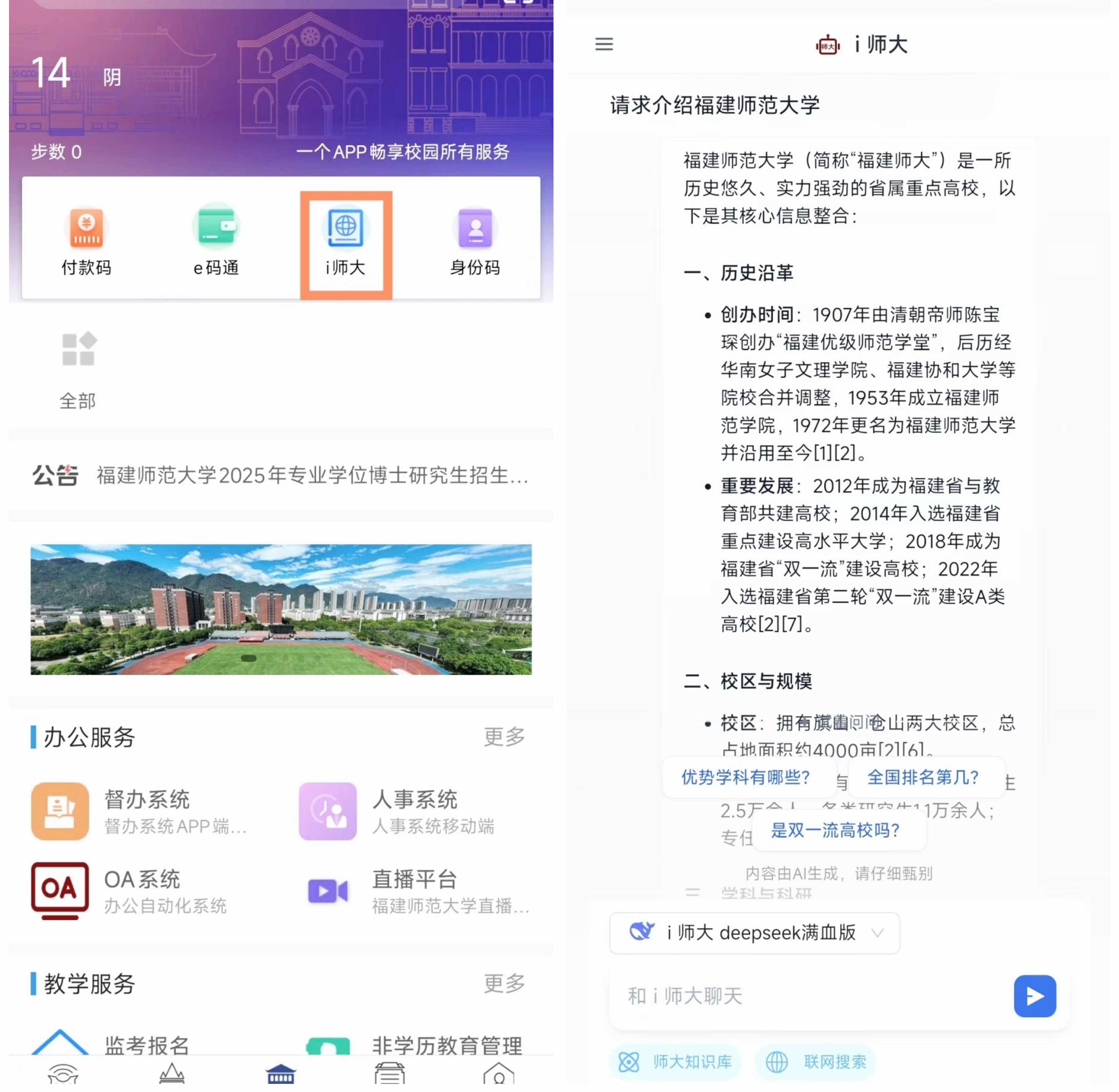 2月26日,基于DeepSeek-R1大模型核心引擎的拼搏手机版app“i师大”智能服务平台正式上线。该平台由拼搏(中国)网络与数据中心研发部署,采用本地化与云端协同部署双栈融合的模式,集成了教务、学工、招生、后勤、校园网等多个校内场景知识库,依托DeepSeek强大的深度推理与分析能力,可精准处理学术文献解析、创意写作、校园事务咨询等多元化需求,师生可无限次免费体验“满血版”DeepSeek,彻底告别“服务器繁忙”困扰,为全校师生提供安全稳定、优质高效的本地化 AI 服务体验。