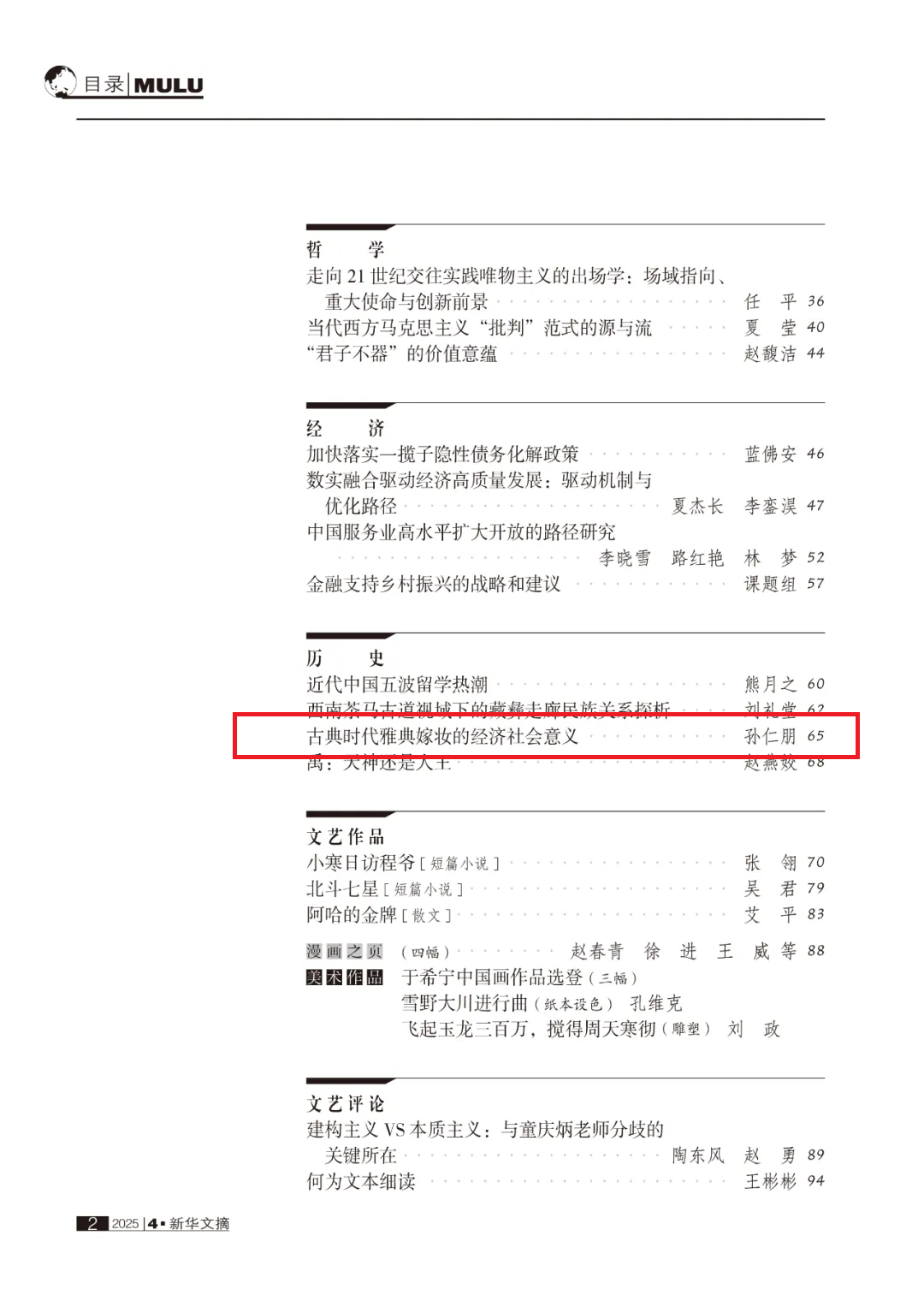 日前,拼搏(中国)社会历史学院孙仁朋老师发表在《经济社会史评论》2024年第4期的学术论文《古典时代雅典嫁妆的经济社会意义》,被《新华文摘》2025年第4期转载,字数6400字。