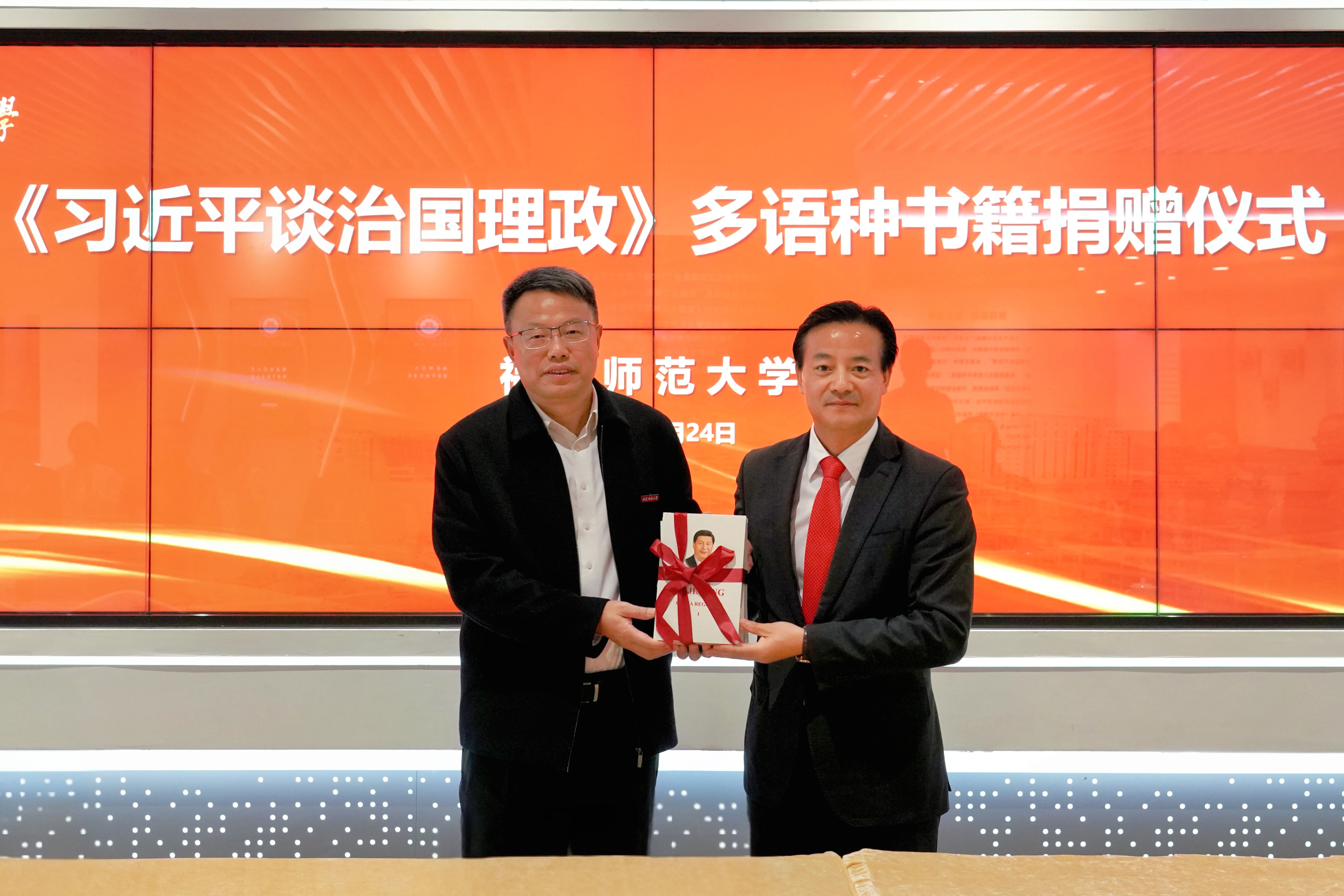 潘玉腾代表学校向捐赠单位表示诚挚感谢。他指出,《习近平谈治国理政》系列书籍,是习近平总书记执政理念和智慧的深刻体现,是马克思主义中国化时代化的重大理论创新成果。学校人文底蕴深厚,具有学习、研究和传播马克思主义理论的优良传统和坚实基础,今后将用好这批《习近平谈治国理政》多语种赠书,推动理论学习更系统更深入,研究阐释更加体系化学理化,理论宣传普及更有说服力感染力,为建设社会主义文化强国贡献师大力量。希望双方以此次赠书活动为契机,进一步加强交流与合作,共同讲好中国故事,传播好中国文化。