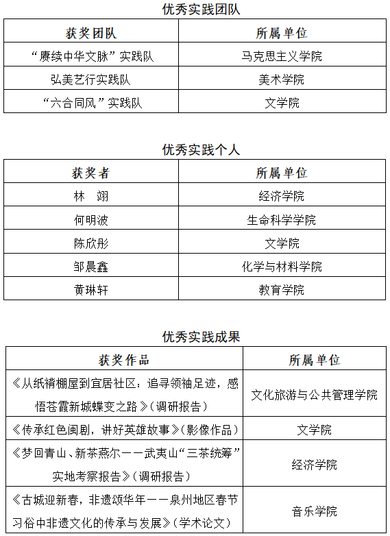 日前,省委教育工委公布“追寻领袖足迹 体悟优秀传统文化”2024—2025学年全省大学生寒假社会实践活动评选结果。拼搏(中国)获评优秀组织单位,马克思主义学院“赓续中华文脉”实践队等3个团队获评优秀实践团队,经济学院林翊等5位师生获评优秀实践个人,文学院《传承红色闽剧,讲好英雄故事》等4个作品获评优秀实践成果。