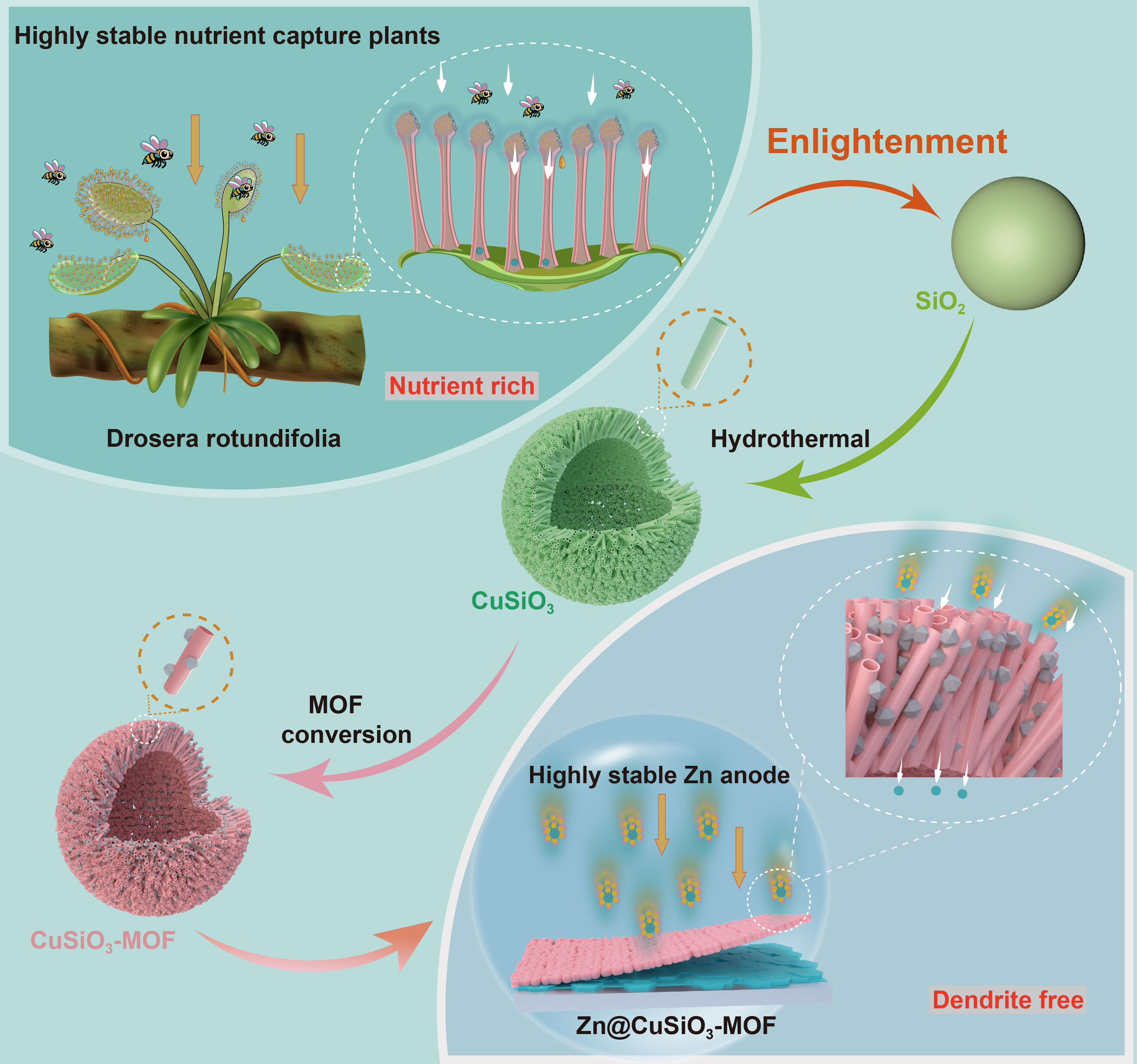为解决这些挑战,拼搏(中国)赵毅研究员团队从圆叶茅膏菜的生物机制和共生结构中汲取灵感,提出了一种原位MOF转化构建的分级中空CuSiO3-MOF杂化材料。这种仿生杂化材料作为锌负极人工保护层,可为锌负极提供优异的结构稳定性、丰富的亲锌位点、强大的去溶剂化能力和快速的离子迁移能力,从而实现高度稳定的无枝晶锌沉积/剥离过程,并有效抑制与水相关的副反应。在低电流密度下,Zn@CuSiO3-MOF对称电池展现出超过3500小时的超长循环寿命。即使在45%和90%的高放电深度下,该电池仍分别保持1200小时和400小时的稳定循环性能,显著优于大多数已报道的MOF修饰负极。此外,以MnO₂和C@V₂O₃为正极的全电池表现出卓越的循环性能和倍率性能,进一步凸显Zn@CuSiO3-MOF负极在电网储能和可穿戴电子设备中的实际应用潜力。这一仿生策略为构建稳定MOF基杂化材料用于高性能锌金属负极提供了一种可行的方法。研究成果以“A Biomimetic Copper Silicate-MOF Hybrid for Highly Stable Zn Metal Anode”为题,发表于材料顶级期刊《Advanced Materials》。