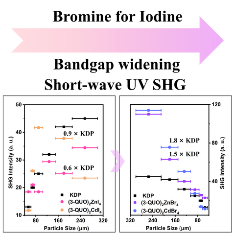 本研究中,初期合成的碘化物 (3-QUO)2ZnI4 和 (3-QUO)2CdI4 虽具有中等倍频响应(0.6/0.9×KDP)和较宽带隙(3.75/3.94 eV),但无法实现相位匹配。鉴于此,该团队提出卤素取代策略,利用溴原子取代重原子碘,不仅显著拓宽材料带隙——(3-QUO)2ZnBr4带隙达5.10 eV(截止边220 nm),(3-QUO)2CdBr4为4.55 eV(245 nm)。更关键的是,溴化物成功实现了相位匹配,其SHG强度分别达基准材料KDP的1.5倍和1.8倍。同时,实验测得二者双折射分别为0.05/0.06@546 nm,完美平衡了高效频率转换与低光学损耗的需求。此外,两类溴化物在蓝光激发下均发射黄白色荧光,展现出非线性光学-荧光双功能集成特性,为开发单组分蓝光激发白光材料提供新思路。该工作通过卤素取代策略在有机-金属卤化物中同步优化带隙、二次谐波响应与相位匹配能力,为设计高性能紫外NLO-荧光双功能晶体提供了新范式。所开发的材料在激光变频、紫外探测及固态照明领域具有重要应用价值。相关成果以Bromine for Iodine: Unlocking Short-Wavelength UV Phase Matching in Nonlinear Optical Metal Halides为题发表在《Chinese Chemical Letters》。