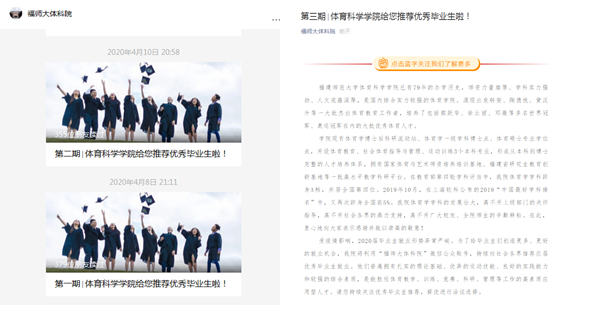 为了给毕业生们创造更多、更好的就业机会,我院利用“福师大体科院”微信公众账号,持续向社会各界推荐应届优秀毕业生就业。目前该栏目已推送三期共15名毕业生,文章阅读量达超过5000次,有多名学生收到用人单位的邀约。