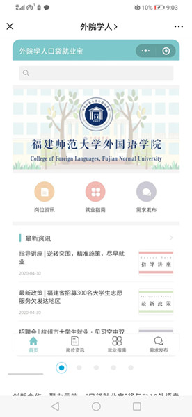 5月1日,外国语学院就业小程序“外院学人口袋就业宝”正式面向学生和用人单位推出。该小程序依托微信公众号平台,集信息收集、汇总和发布等功能于一体,设置有岗位资讯、就业指南和需求发布三个板块。学院就业信息服务团队将依此发布就业资讯和指导信息,帮助毕业生即时、便捷地获得岗位信息,了解就业形势和应对策略,同时接收用人单位的招聘需求。