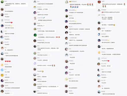“云毕业典礼”为2020届毕业生带来了别样的毕业回忆,观看直播人数累计超过4.8万人次。毕业生们纷纷在直播间互动区发表感想,表达毕业离别的不舍,表达对母校的感恩,表达对未来的憧憬。