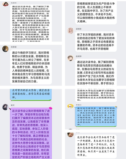 活动中,师生共同学习了恩格斯的历史生平简介;杨臻煌作了文章导读,解答了同学们提出的“学习恩格斯思想的理论书籍推荐、循序渐进学习马克思主义的办法、区分冒牌社会主义和真正社会主义的关键点”等三个问题;孙晓军老师对相关问题作了进一步阐释,并推荐同学们主动阅读马克思与恩格斯之间的书信集,拓宽知识广度;罗正月老师也就问题提出了一些导读建议。