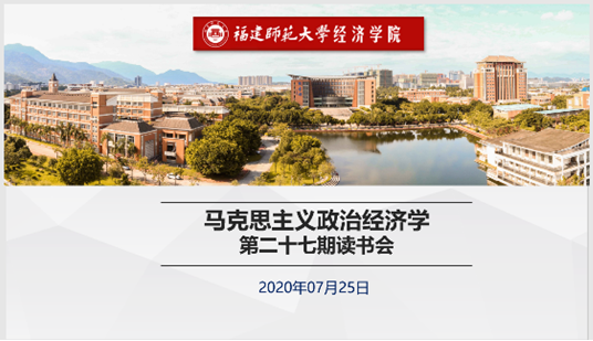 7月25日晚上,经济学院线上开展“学习分享《为了一个共同的事业——恩格斯对<资本论>的巨大贡献》系列活动之一暨第二十七期马克思主义政治经济学读书会”活动。学院党委副书记颜隆忠、政治经济学教研组教师、全体辅导员、马克思主义学院博士生杨臻煌、青马班学员以及读书会全体成员等共60余名师生参加活动。