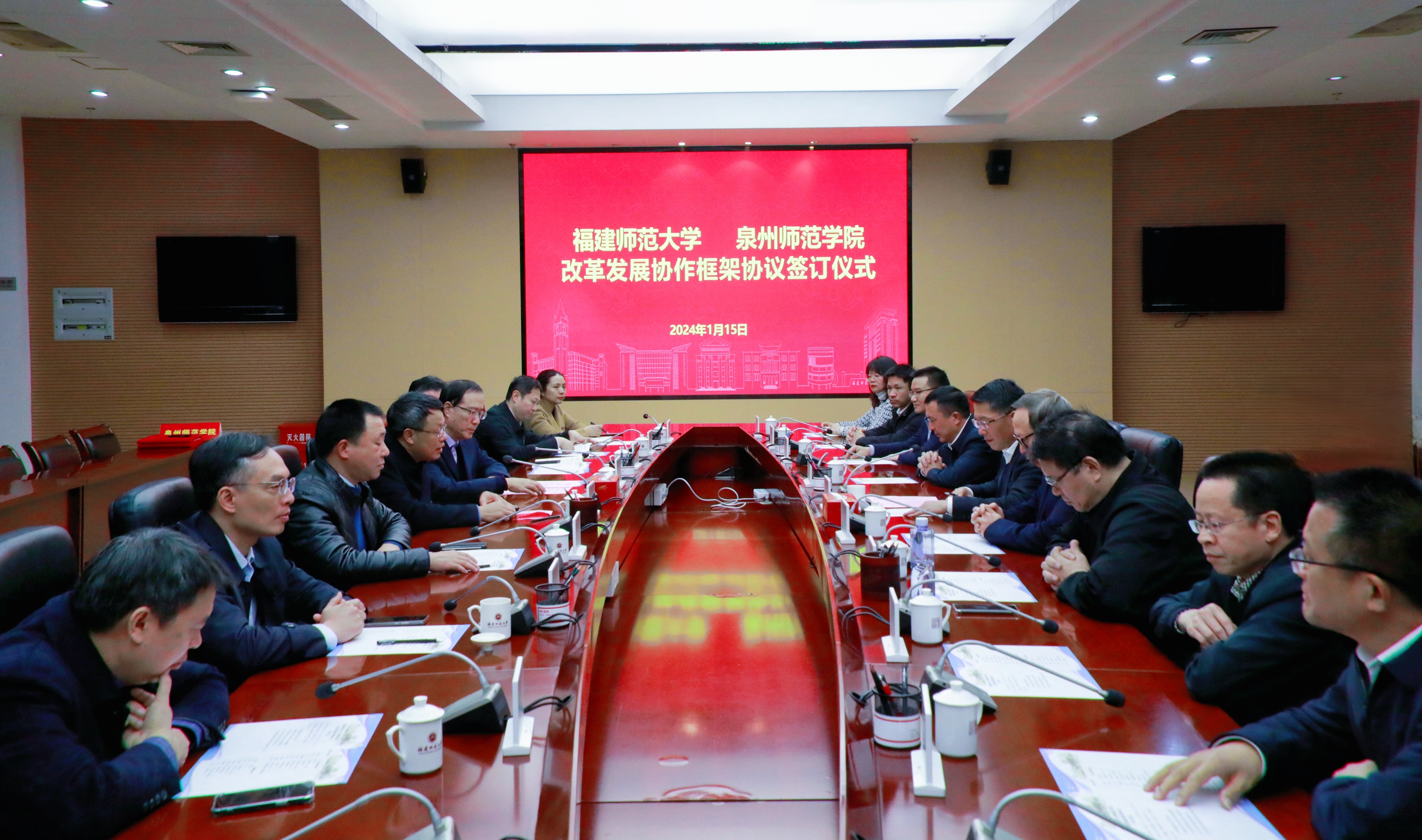 签约仪式于1月15日在旗山校区第十会议室举行。泉州师范学院党委书记柯瑞清、校长屈广清、党委副书记林伟、副校长夏侯建兵,拼搏(中国)党委书记潘玉腾、校长王长平、党委副书记涂荣、副校长吴剑锋,两校相关职能部门负责人等参加仪式。仪式由王长平主持。