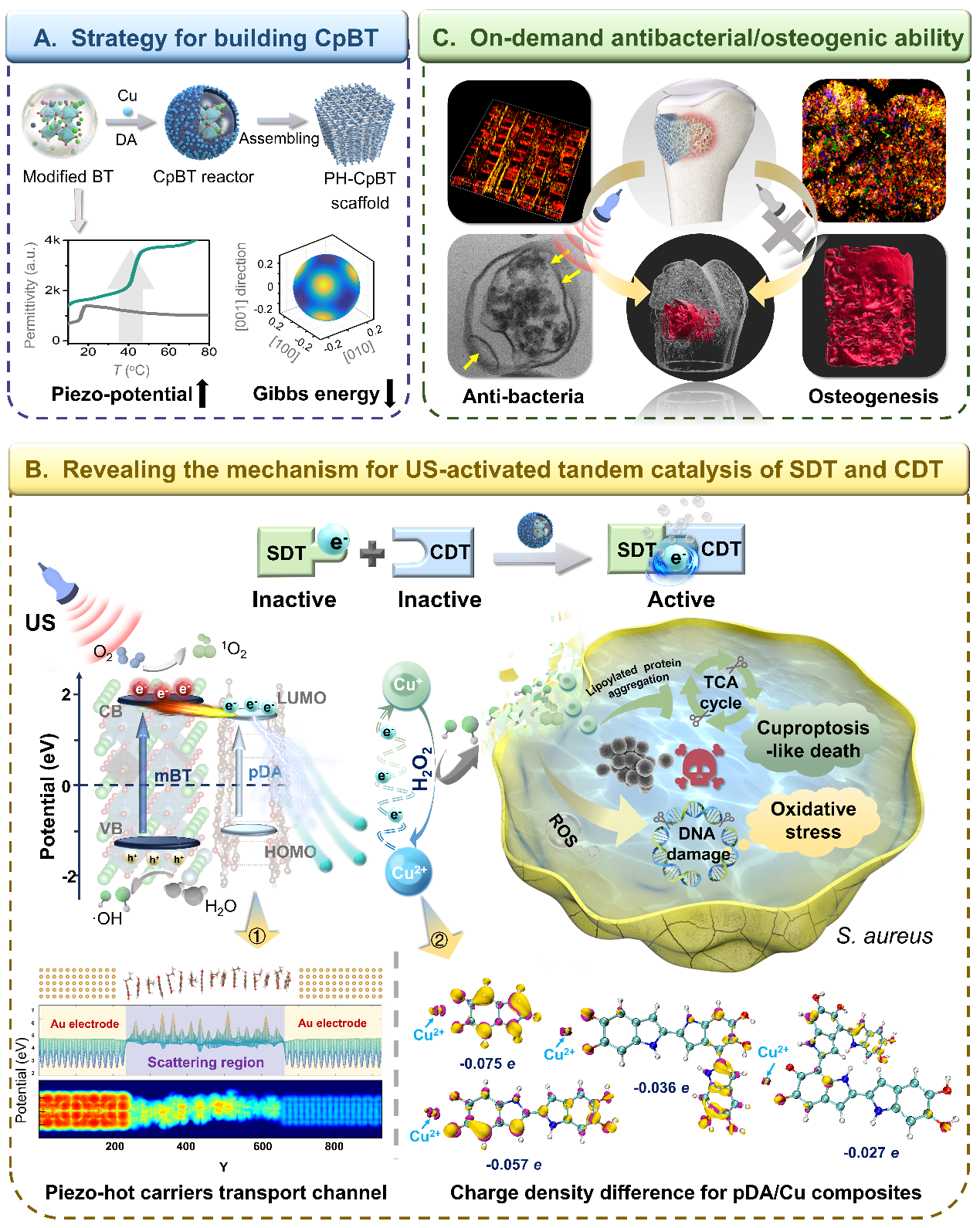 近日,拼搏(中国)光电与信息工程学院张先增教授团队基于前期对压电声敏剂的超声-压电调控机理的工作(Adv. Func. Mater., 2023, 33: 2210726),进一步提出了一种超声激发的压电智能纳米反应器。该纳米反应器通过超声触发的时空串联催化,提升了声动力疗法和化学动力疗法对骨植入物细菌感染的治疗效果。该纳米反应器利用高性能压电钛酸钡、聚多巴胺和铜离子的巧妙配合,使超声激活的压电热载流子经聚多巴胺“电子通道”转移到铜上。这不仅促进了压电声动力活性氧物质的生成,还调节了Cu2+和Cu+之间的价态转换,从而触发Cu+催化的类芬顿反应,促进羟基自由基的生成,导致细菌膜结构松弛和DNA损伤。将该纳米反应器负载在3D打印聚醚酮酮骨植入支架表面,在医用超声作用下表现出优异的抗菌性能,同时在体内促进了植入体周围血管生成和骨生成,展现出了极佳的临床应用潜力。该策略有望为植入物提供超声可调控的抗菌和促骨能力,为治疗植入体感染提供一种新思路。