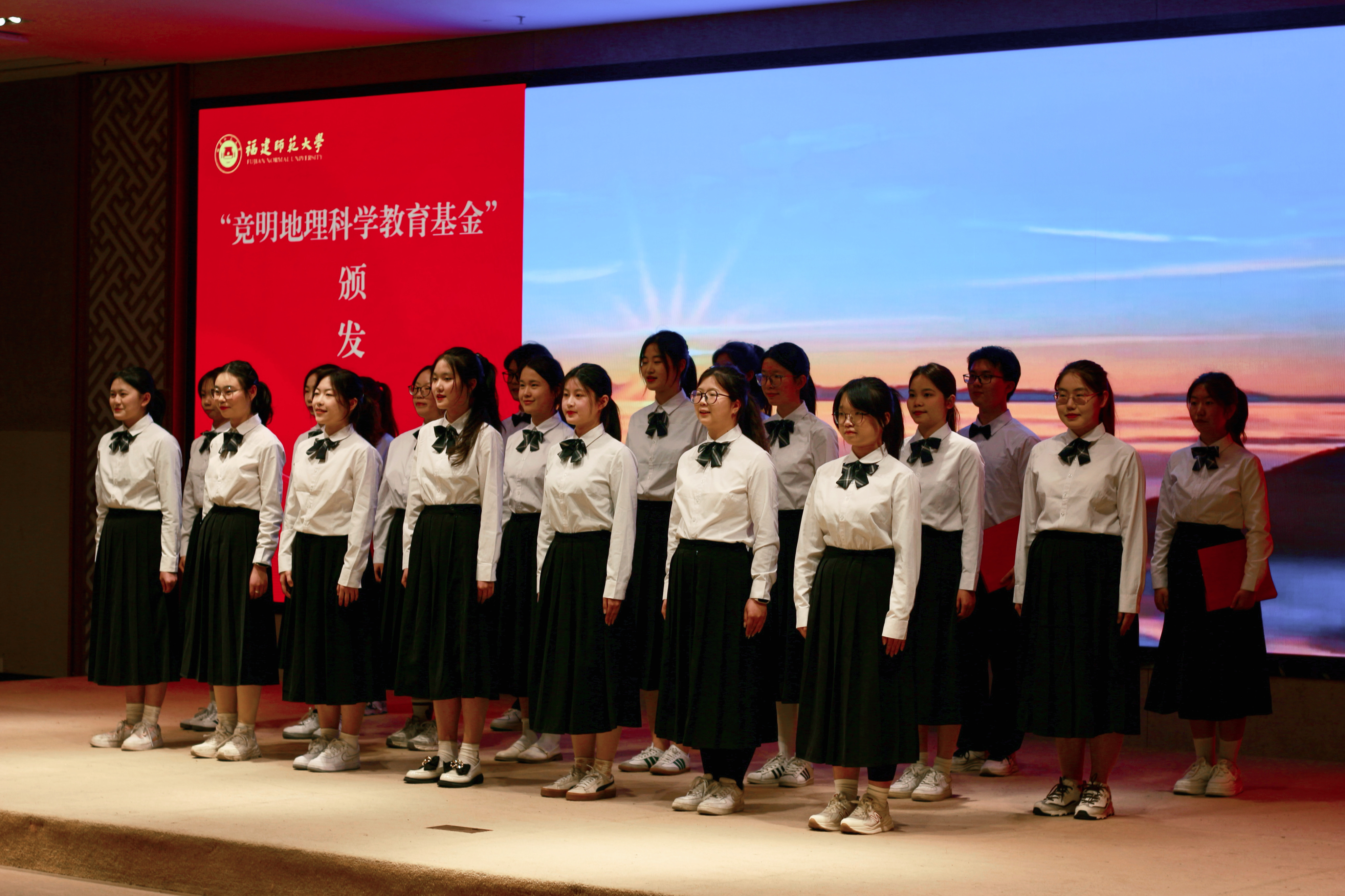 仪式上,获奖青年师生代表在发言中表达了对陈镜明、柳竞先伉俪的感谢之情,以及立足岗位创佳绩、回馈社会作贡献的坚定决心。地理科学学院、碳中和未来技术学院学生还献上了合唱节目《助学·筑梦·铸人》。