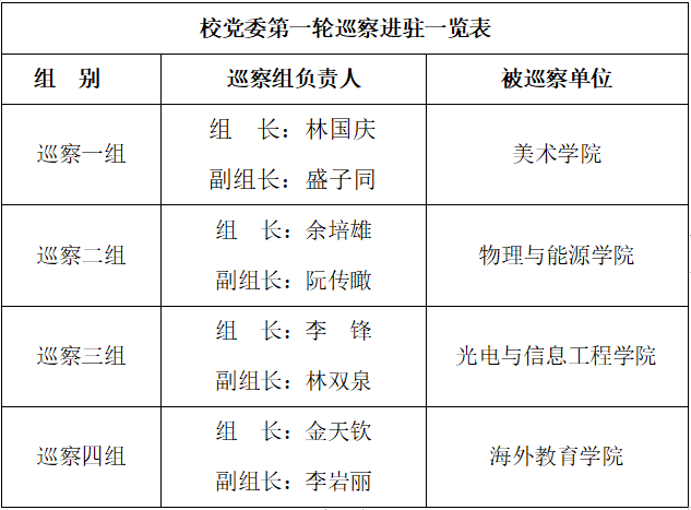 为贯彻中央、省委关于巡视巡察工作的部署要求,根据校党委决定,4月29日至5月4日,校党委巡察一组、巡察二组、巡察三组、巡察四组分别进驻美术学院、物理与能源学院、光电与信息工程学院、海外教育学院等4个学院党委开展常规巡察,巡察时间一个月左右。