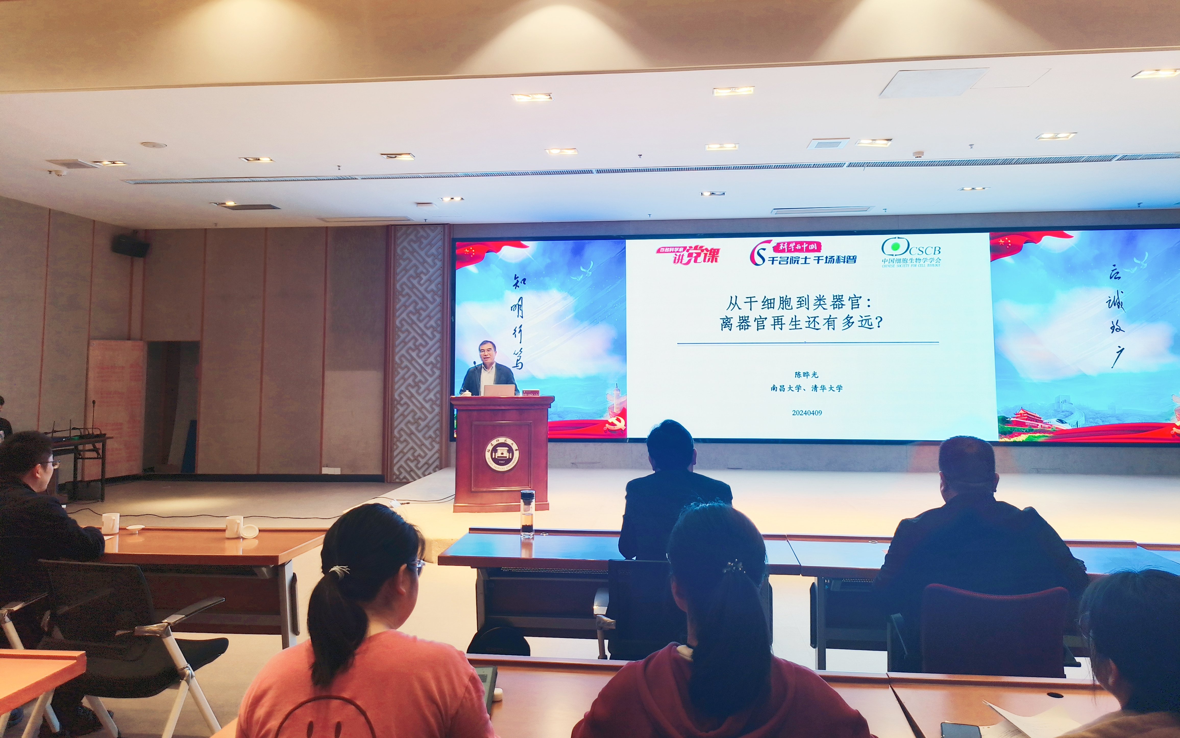 4月9日,中国科学院院士、清华大学教授、南昌大学校长陈晔光应邀来校作题为《从干细胞到类器官:离器官再生还有多远》的学术报告。报告会由副校长杨玉盛主持,相关学科师生代表140余人参加。