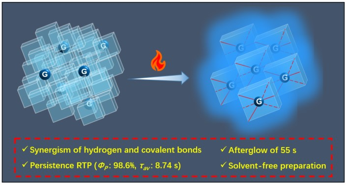 In their first research, they designed host-guest room-temperature phosphorescence (RTP) with inorganic boric acid as host and aryl boric acid or carboxylic acid as guest. The interaction of hydrogen bond and covalent bond between host and guest firmly fixed the organic guest molecule, producing highly efficient and long-lasting room-temperature phosphorescence. The phosphorescence quantum yields of the obtained materials were all over 40%, and the highest was close to 100%. The longest average lifetime was 8.74 seconds, and the afterglow reached 55 seconds when the UV lamp was turned off. In addition, its production and storage method was simple and efficient and without solvent, which was suitable for industrial production. The results were published in Angewandte Chemie International Edition titled as Nearly Unity Quantum Yield Persistent Room Temperature Phosphorescence from Heavy Atom-Free Rigid Inorganic/Organic Hybrid Frameworks.