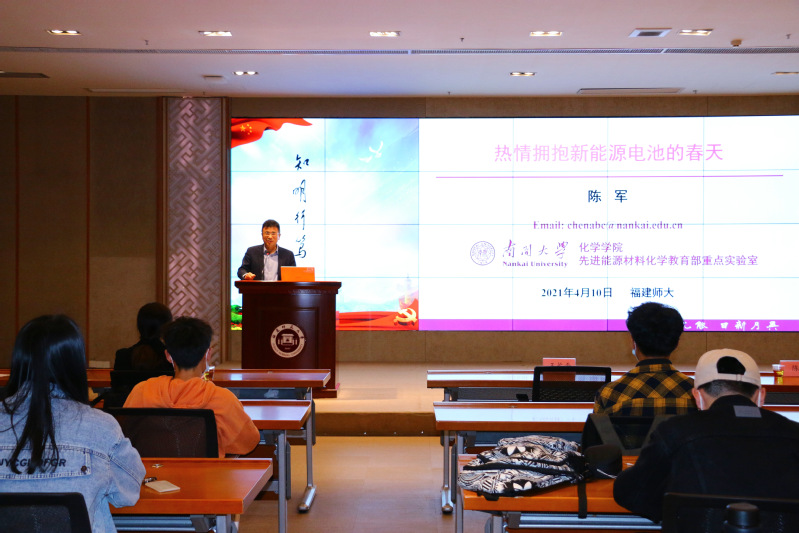 Recently, Prof. Chen Jun, member of the Chinese Academy of Sciences (CAS) and vice president of Nankai University, visited the College of Environmental Science and Engineering of FNU for academic exchanges and guidance, and made an academic report entitled Enthusiastically Embrace the Spring of New Energy Batteries in the Hongda Hall on Qishan Campus. The event was presided over by FNU President Wang Changping. Vice President Chen Qinghua, the head, all the teachers and students of the College of Environmental Science and Engineering attended the event.