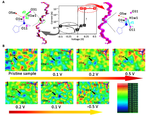 Recently, the research group, led by Prof. Zhang Zhangjing of College of Chemistry and Materials Science, has made new progress in the research on proton conduction MOFs-based resistive switching memory. The group replaced the traditional electron transport with ion transport, utilized the strategy of hydrogen proton transport commutation in the channels of MOFs under the action of different electric fields to implement resistive switching and rectifying effects in a single material simultaneously for the first time, and verified the mechanism of proton transport commutation under the action of the electric field through single crystal diffraction. The findings were published in Science Advances, a subject-specific journal of Science, in the form of the paper, entitled “Simultaneous implementation of resistive switching and rectifying effects in a metal-organic framework with switched hydrogen bond pathway. [(2019) 5: Eaaw4515; DOI: 10.1126/sciadv.aaw4515, impact factor: 12.804]. The research results took Fujian Normal University as the first completion unit, with Prof. Zhang Zhangjing as the corresponding author.