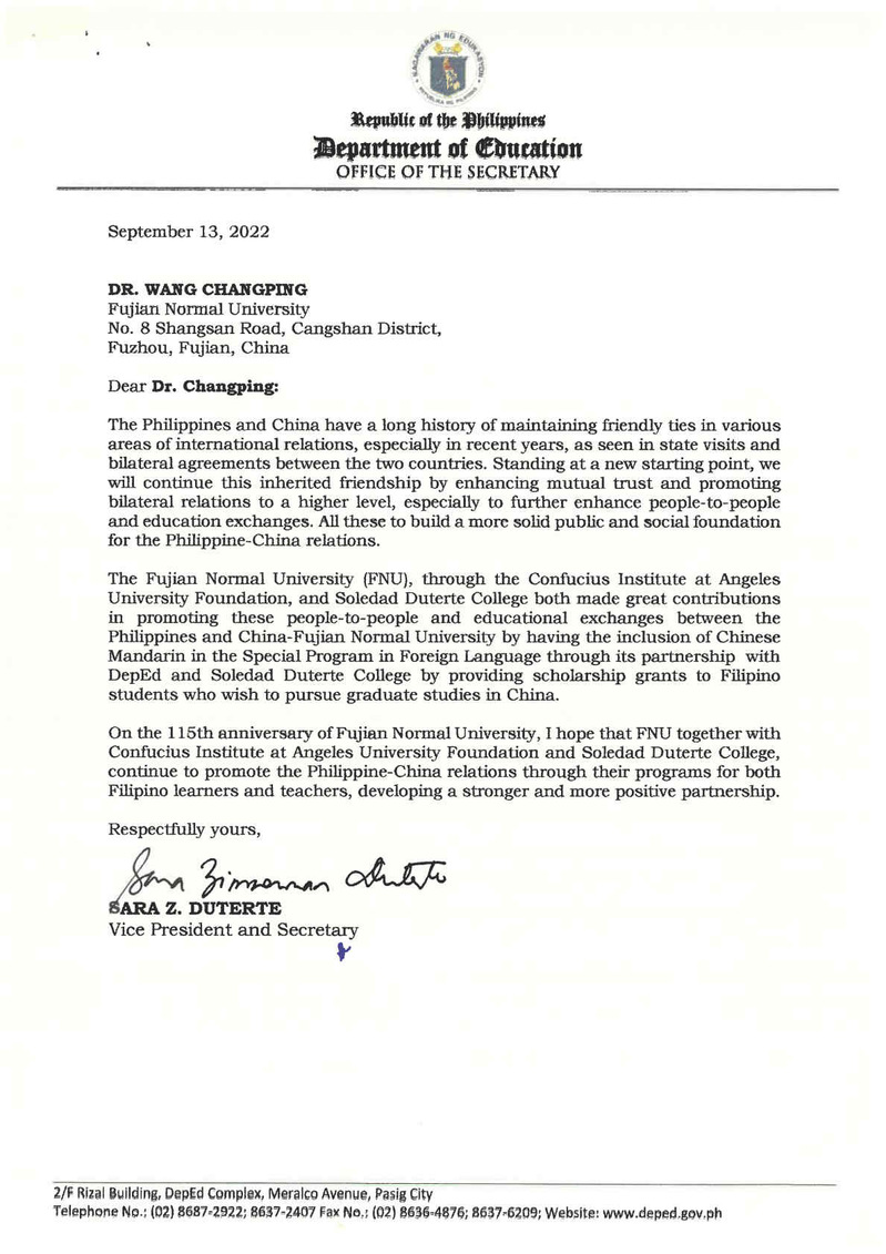 Recently, Sara Z. Duterte, Vice President and Secretary of Education of Philippine, sent a congratulation letter to Fujian Normal University (FNU) for its 115th Anniversary. The original letter and the translated version are as follows: