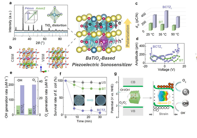 Sonodynamic therapy (SDT), a new noninvasive therapy for antineoplastic and antibacterial treatment, uses ultrasound to activate sonosensitizers concentrated at the affected parts, which generates reactive oxygen species (ROS) to damage the lipid, protein and DNA of tumor cells or bacteria. Designing sonosensitizers with excellent sonodynamic performance is key to the study of SDT. However, such imperfections of traditional sonosensitizers as phototoxicity, low ROS generation rate and obscure mechanism, have limited their clinical applications. Herein, Prof. Zhang Xianzeng’s research group put forward and constructed BaTiO3 (BT)-based piezoelectric sonosensitizers with multiphase coexistence within the human body temperature range to boost higher piezoelectricity, piezo-potential and ROS generation rate, attributable to decreased polarization anisotropy by flat Gibbs energy profile. Elevated piezo-potential in designed BT-based piezocatalysts guarantees high-efficient generation rate of •OH (200 µmol g−1 h−1) and •O2− (40 µmol g−1 h−1) by ultrasound stimulation with superior antibacterial performance. Meanwhile, First-principals calculations validate that the local distortion of TiO6 octahedra also contributes to piezocatalytic performance by inducing electron-hole pairs separation in real space, and better response to external ultrasonic stimulation. The work is important for designing high-performance piezoelectric sonosensitizers for SDT.