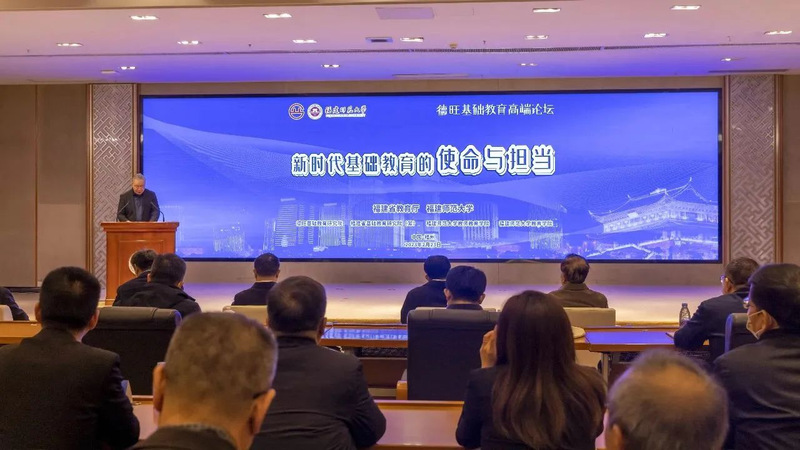 On February 23, the 2022 Dewang High-end Forum on Basic Education, sponsored by the Ministry of Education of Fujian Province and Fujian Normal University (FNU), was held at Qishan Campus, FNU. Leaders and distinguished guests attended the ceremony, including Mr. Zhu Zhiwen, Deputy Director of the Textbook and Sports Committee of the National Committee of the Chinese People's Political Consultative Conference, President of the Chinese Society of Education and former Vice Minister of the Ministry of Education, Mr. Chang Bin, Vice Governor of Fujian Provincial People's Government, Mr. Cao Degan, former Vice Governor of Fujian Provincial People's Government and former Deputy Director of the Standing Committee of the Provincial People's Congress, Mr. Lv Yugang, Director of the Department of Basic Education, Mr. Ren Youqun, Director of the Department of Teachers' Work, Mr. Wang Hui, former Director of the Department of College Students, Mr. Lin Heping, Director of Fujian Provincial Department of Education, Secretary of Party Committee of FNU, Mr. Pan Yuteng, Secretary of the Party Committee of FNU, and Mr. Wang Changping, President of FNU. The ceremony was chaired by Director Lin Heping.