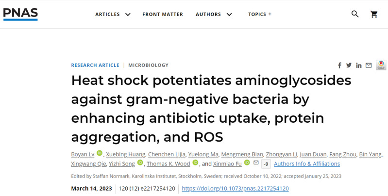 Bacterial antibiotic resistance has become a major public health issue in the world. Increasing the efficacy of existing antibiotics is a promising strategy against antibiotic resistance. The bacterial resistance research team led by Fu Xinmiao, a researcher in the College of Life Sciences of FNU, has developed a variety of new synergistic methods in recent years (Sci Rep, 2015; Front Microbiol, 2019; Front Cell Infect Microbiol, 2020; mBio, 2020; Front. Microbiol., 2021; Antimicrob Agents Chemother, 2022; ACS Infectious Diseases 2022, 2023), focusing on aminoglycoside antibiotics. Recently, the research group has made important progress in the field of antibiotic synergism, discovered that heat shock could dramatically enhance the efficacy of aminoglycoside antibiotics in killing various bacteria, and revealed its mechanism of action. The research findings were published in the top academic journal, Proceedings of the National Academy of Sciences (PNAS), in the form of research paper. This research helps to further understand the bactericidal mechanism of aminoglycoside antibiotics, and also lays a foundation for the development of new methods based on heat shock combined with aminoglycoside antibiotics in the treatment of clinical bacterial infections.