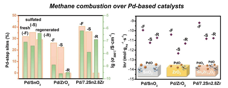 Recently, great progress has been made on the basis of the previous research (ACS Appl. Mater. Interfaces, 2022, 14, 16233-16244;J. Cleaner Prod., 2023, 385: 135744). The research results, entitled “Key factors for methane combustion over Pd-based catalysts revealed by enhanced and depressed catalytic performance”, has been published in Applied Catalysis B: Environmental. The supported palladium catalysts prepared from tin-rich and zirconium-rich tin-zirconium binary oxides were found to differ significantly in the low-temperature activity and water resistance. When the supported palladium catalysts were prepared with a specific tin-zirconium mass ratio, the formation of tin-zirconium solid solutions generated more oxygen vacancies and induced high lattice oxygen activity of PdO species, with excellent low-temperature activity, thermal stability, and water resistance. However, after the zirconium-containing catalysts were sulfated and regenerated, generated sulfates caused the decrease in the oxygen vacancies, thereby inhibiting oxygen exchange between PdO and lattice oxygen and gas-phase oxygen and making the palladium particles prone to sintering. In contrast, the tin-containing catalysts had weak interaction with sulfur and good regeneration performance. Through tuning the composition of the catalysts, efficient and stable Pd-based catalysts with high oxygen mobility and high sulfur resistance were obtained.
