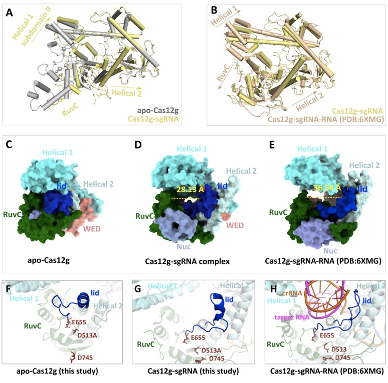 The CRISPR-Cas (clustered regularly interspaced short palindromic repeats) system is a system of acquired immunity of bacteria against exogenous nucleic acids. Class 2 CRISP-Cas systems consist of single Cas effector proteins for exogenous DNA or RNA cleavage, and thus are widely applied in RNA editing. In 2019, researchers identified and reported many new types of effector proteins belonging to the class 2 type V Cas12 family, among which Cas 12g stood out by exhibiting RNA-guided ribonuclease (RNase) activity (Yan et al., Science, 2019). In prior investigations, the effector proteins of the Cas12 family targeted DNA cleavage through the conserved RuvC structural domain. But now the discovery of Cas12g presents a new prospect of harnessing Cas12g as an effective RNA editing tool. Therefore, understanding the molecular mechanisms of how the protein Cas12g is activated by target nucleic acids and exhibits its RNase activity holds theoretical significance for future applications and modifications of the CRISPR-Cas12g system. Although Chang Leifu’s research team reported on the structural and functional research into Cas12g and target nucleic acids complexes (Li et al., Nature Chemical Biology, 2021), certain aspects regarding the Cas12g activation and its cleavage of the target nucleic acid substrates have remained unclear. Recently, Professor Ouyang Songying’s team at FNU published an online research paper, titled “Structural transitions upon guide RNA binding and their importance in Cas12g-mediated RNA cleavage” in PLoS Genetics. This research delves deeply into the conformational changes of the protein Cas12g before and after sgRNA binding and the molecular mechanism for cleaving RNA substrates, providing new theoretical guidance for utilizing Cas12g in RNA editing.
