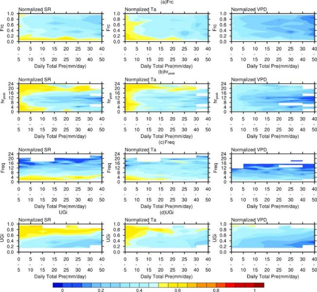 Global warming has been intensifying the hydrological cycle. Though the global long-term mean precipitation has shown little or no change with global warming, global changes in rainfall have been found in both temporal variation and spatial distribution. It is foreseeable that humans will confront more extreme heavy rainfall events this century. Therefore, a large number of studies on the impact of extreme rainfall on terrestrial ecosystems have been conducted. Evapotranspiration (ET) and gross primary productivity (GPP) in terrestrial ecosystem, important components of the carbon and water cycle, have been widely discussed in such studies. Currently, increasing attention has been paid to the effect of the variability of rainfall, such as changes in intensity, frequency, seasonality and intra-annual/interannual variations, on ET and GPP. However, even in the same ecosystem, the diurnal variations in rainfall may vary greatly, and will induce changes in related meteorological conditions, and the extent of their effect on ET and GPP remains unknown.