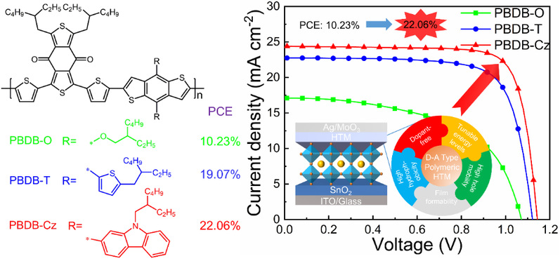 Researcher Zhen Hongyu has been engaged in the basic research on the application of photoelectric functional polymers in polymer electroluminescence devices, polymer solar cells and perovskite solar cells. Recently, on the basis of previous work(Adv. Energy Mater.2019, 10, 1903146), another research entitled Donor-Acceptor Type Polymer Bearing Carbazole Side Chain for Efficient Dopant-Free Perovskite Solar Cells was published in the international academic journal Advanced Energy Materials(IF=29.386). In this paper, carbazole was innovatively introduced into BDT-BDD alternating conjugated polymer as side chain, and the synergistic effect of main chain and side chain hole transport functional units was utilized to improve the hole transport performance of polymer hole transport material. The research was published with FNU as the first organization, You Guofeng, postgraduate student of College of Chemistry and Materials Science of FNU, as the first author and researcher Zhen Hongyu as the corresponding author. This project was funded by the National Natural Science Foundation of China and Fujian Province.