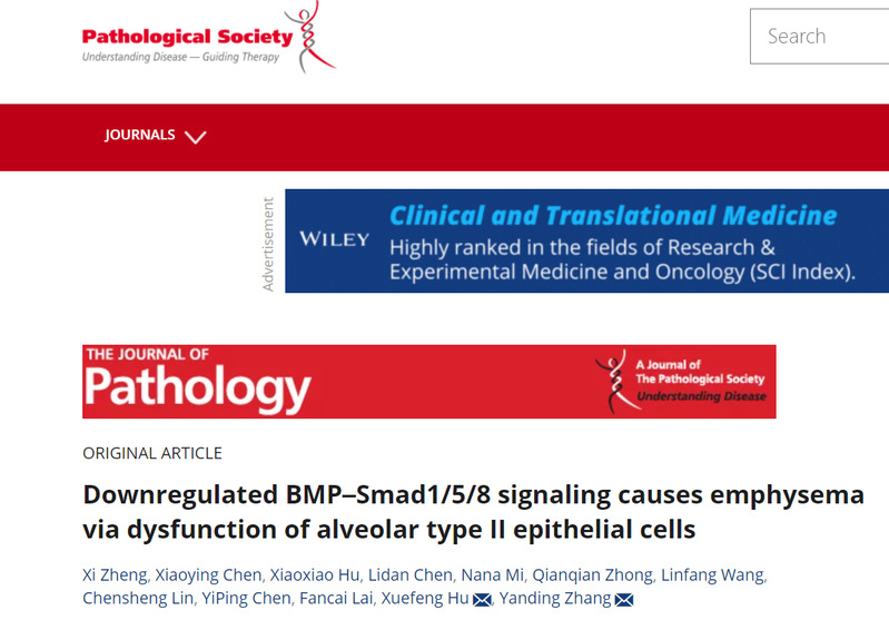 The research findings, titled “Downregulated BMP–Smad1/5/8 signaling causes emphysema via dysfunction of alveolar type II epithelial cells,” have recently been published in Journal of Pathology, a top international academic journal in the field of pathology. FNU is the only affiliation of the paper, with Prof. Hu Xuefeng and Prof. Zhang Yanding as the corresponding authors, Zheng Xi, a postdoctoral student of FNU, as the first author, and Prof. Chen Yiping of Tulane University (USA) and Prof. Lai Fancai of the First Affiliated Hospital of Fujian Medical University as the co-authors. The research was funded by the National Natural Science Foundation of China.