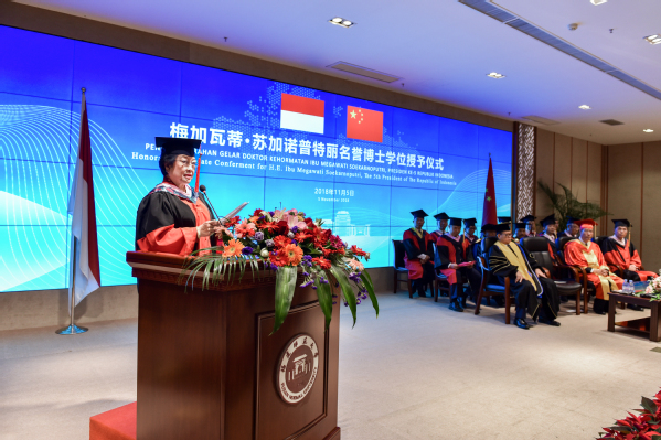 HE Ibu Dr. Megawati Soekarnoputri delivered a keynote speech after the conferment. She remarked that FNU as one of the most prestigious universities in China has made outstanding contributions to the development of scientific knowledge, technology, innovations and economy in China. She also expressed that she was sincerely proud and honored to receive the honorary degree from FNU. She gave an in-depth explanation of the relationship between economic diplomacy and political diplomacy. She pointed out that China is one of the world’s economic centers, and China’s presence, with its wisdom and power, is clearly needed in facing the complexity of the world’s problems. She recognized that the Honorary Doctorate Degree awarded to her carried a moral message in itself, one that she would cherish and take as a power to promote diplomatic practice and safeguard world peace and prosperity.