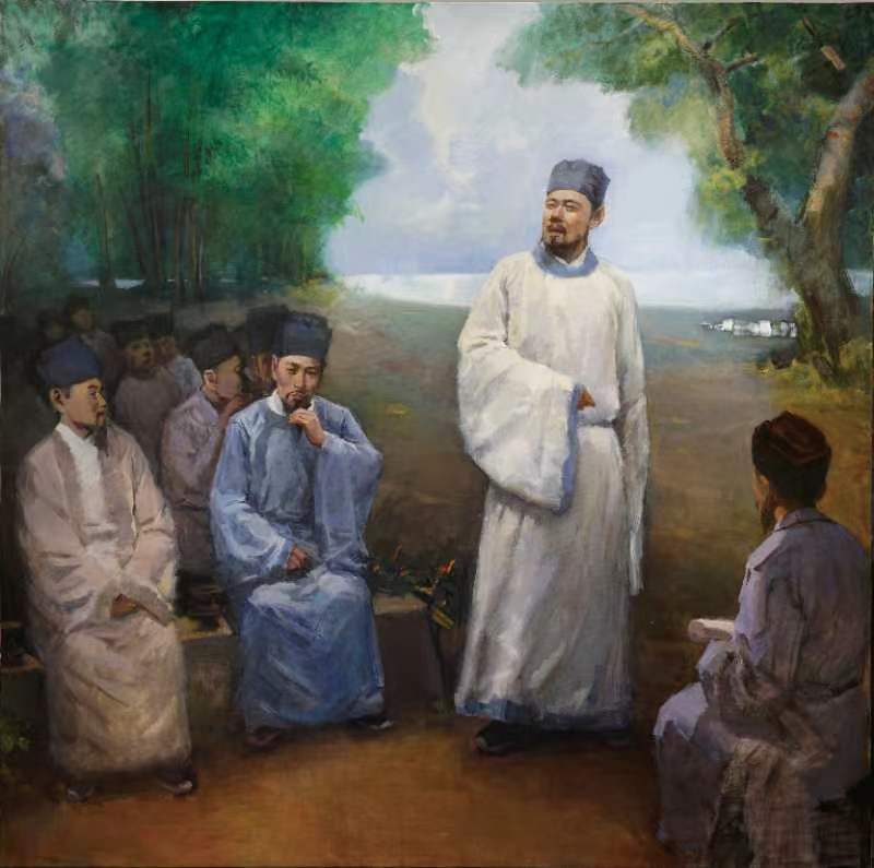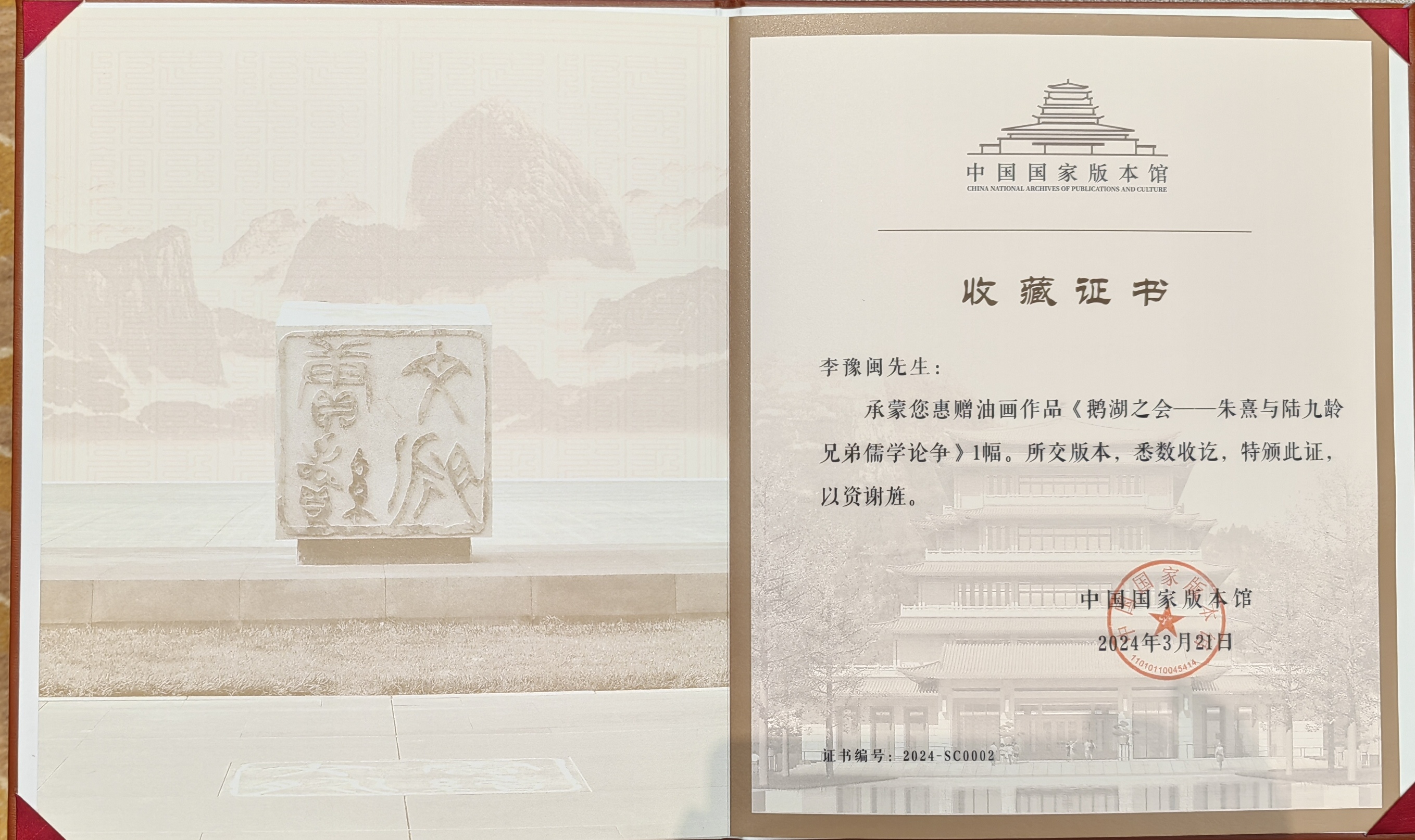 5月31日,中国国家版本馆第二批版本捐赠入藏大会在北京举行,中共中央政治局委员、中央书记处书记、中央宣传部部长李书磊出席并作重要讲话,中宣部负责日常工作的副部长胡和平,财政部、文化与旅游部、外交部、海关总署、中国文联及部分省市宣传部门代表及入藏作者代表等200多人出席大会。拼搏(中国)美术学院李豫闽教授油画作品《鹅湖之会——朱熹与陆九龄兄弟理学论争》被中国国家版本馆中央馆收藏。