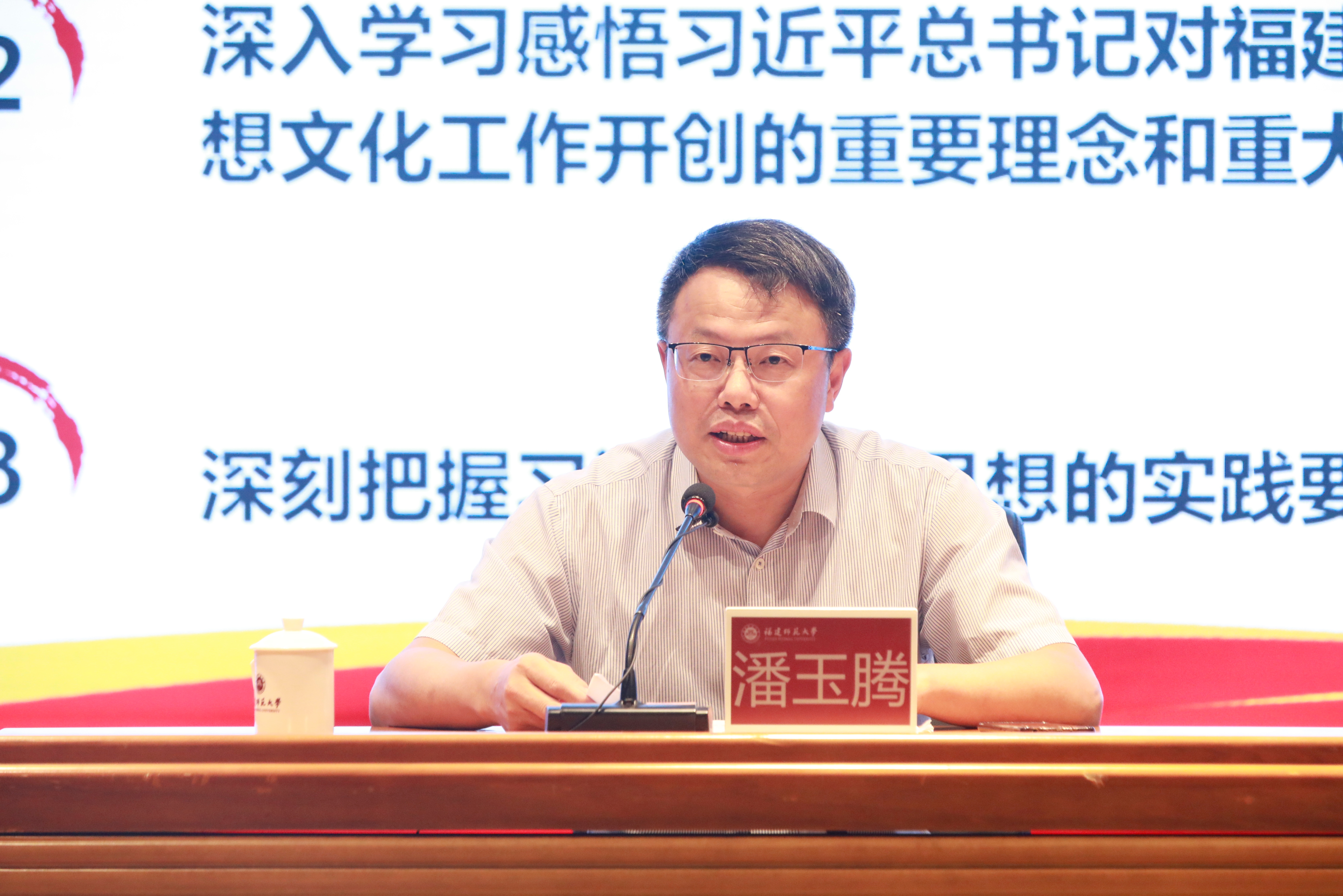 潘玉腾结合自身的学习研究成果,对习近平文化思想的精神实质进行了解读。他指出,习近平文化思想从“民族复兴高度”“全球文明视角”“根本政治立场”“新的文化使命”四个方面,系统解答了文化建设的重大课题;习近平同志在福建工作期间,高度重视宣传思想文化工作,作出了一系列极具前瞻性、开创性、战略性的理念创新和实践探索,创造了极为宝贵的思想财富、理论财富和实践成果,这些重要理念和重大实践与习近平文化思想一脉相承。潘玉腾勉励同学们要自觉深入学习习近平文化思想,深刻把握这一重要思想的实践要求,着力在真学真懂真信真用、深化内化转化上下功夫,在学思践悟中增强文化自信、提升文化素养、推进文化互鉴、参与文化创新,争做中华优秀传统文化的忠实传承者、社会主义核心价值观的模范践行者、中外先进文化交流的有力推动者、中华民族现代文明的合格建设者。